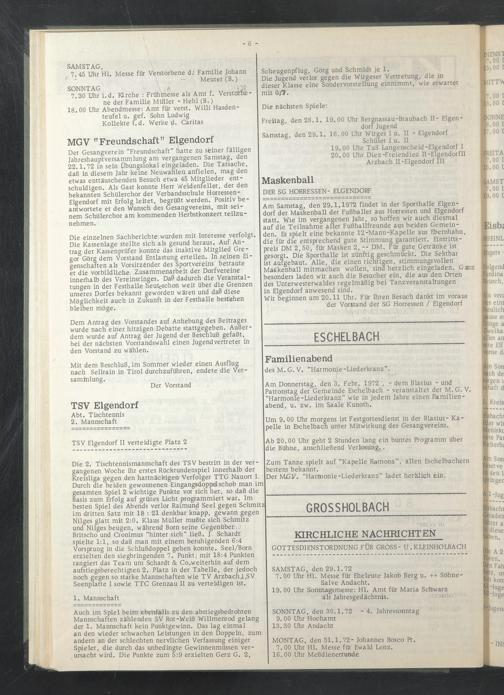 Am Donnerstag, den 3. Febr. 1972 , - dem Blasius - und Patronstag der Gemeinde Eschelbach - veranstaltet der M.G. V. "Harmonie-Liederkranz" wie in jedem Jahre einen Familien- abend, u. zw. im Saale Kunoth.