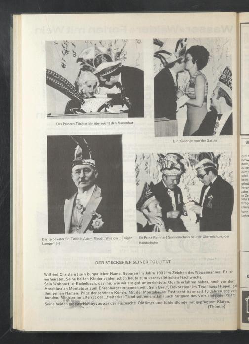 Sein Wohnort ist Eschelbach, das ihn, wie wir aus gut unterrichteter Quelle erfahren haben, noch vor dem 'I Anschluss an Montabaur zum Ehrenbürger ernennen will. Sein Beruf, Dekorateur im Textilhaus Hisgen, gab ihm seinen Namen: Prinz der schönen Künste. Mit der Montabaurer Fastnacht ist er seit 10 Jahren eng verbunden. Minister im Elferrat der „Heiterkeit” und seit einem Jahr auch Mitglied des Vorstan*fei|der QKM-