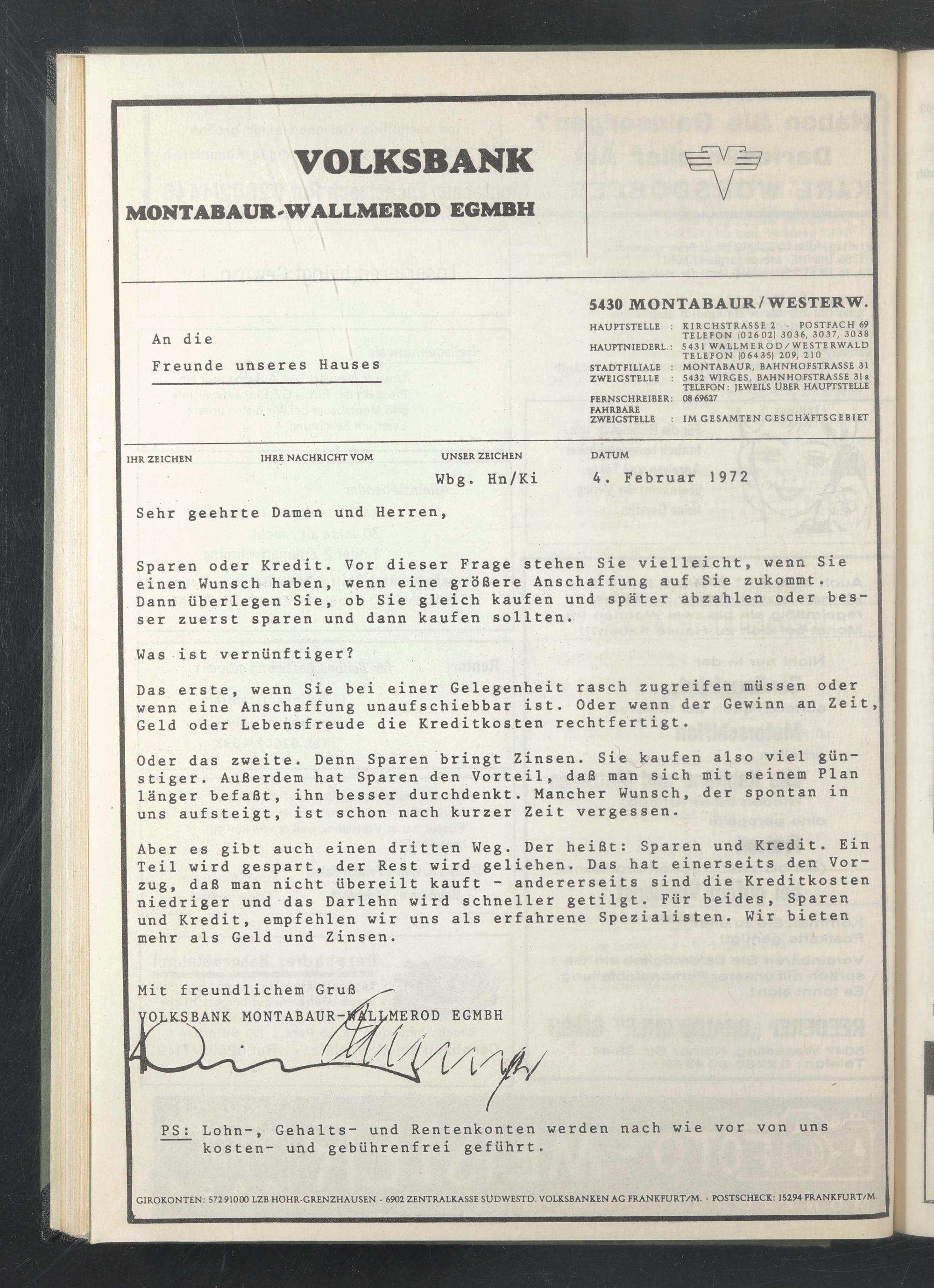 GIROKONTEN: 57291000 LZB HÖHR-GRENZHAUSEN - 6902 ZENTRALKASSE SÜDWESTD. VOLKSBANKEN AG FRANKFURT/M. - POSTSCHECK: 15294 FRANKFURT/M.