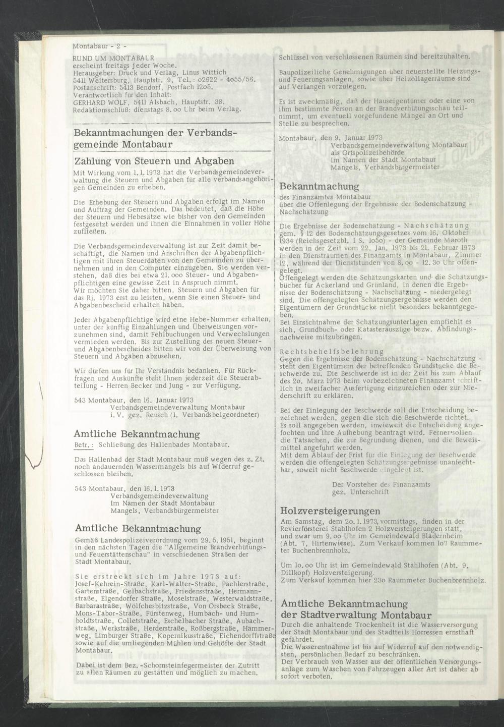 Am Samstag, dem 2o. 1.1973, vormittags, finden in der Revierförsterei Stahlhofen 2 Holzversteigerungen statt, und zwar um 9. oo Uhr im Gemeindewald Bladernheim (Abt. 7, Hirtenwiese). Zum Verkauf kommen lo7 Raummeter Buchenbrennholz.
