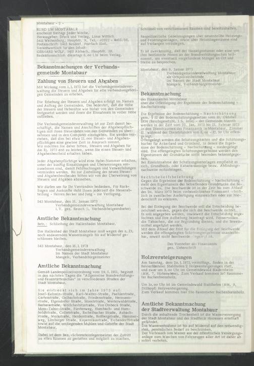 Die Verbandsgemeindeverwaltung ist zur Zeit damit beschäftigt, die Namen und Anschriften der Abgabenpflichtigen mit ihren Steuerdaten von den Gemeinden zu übernehmen und in den Computer einzugeben. Sie werden verstehen, daß dies bei etwa 21. ooo Steuer- und Abgabenpflichtigen eine gewisse Zeit in Anspruch nimmt.