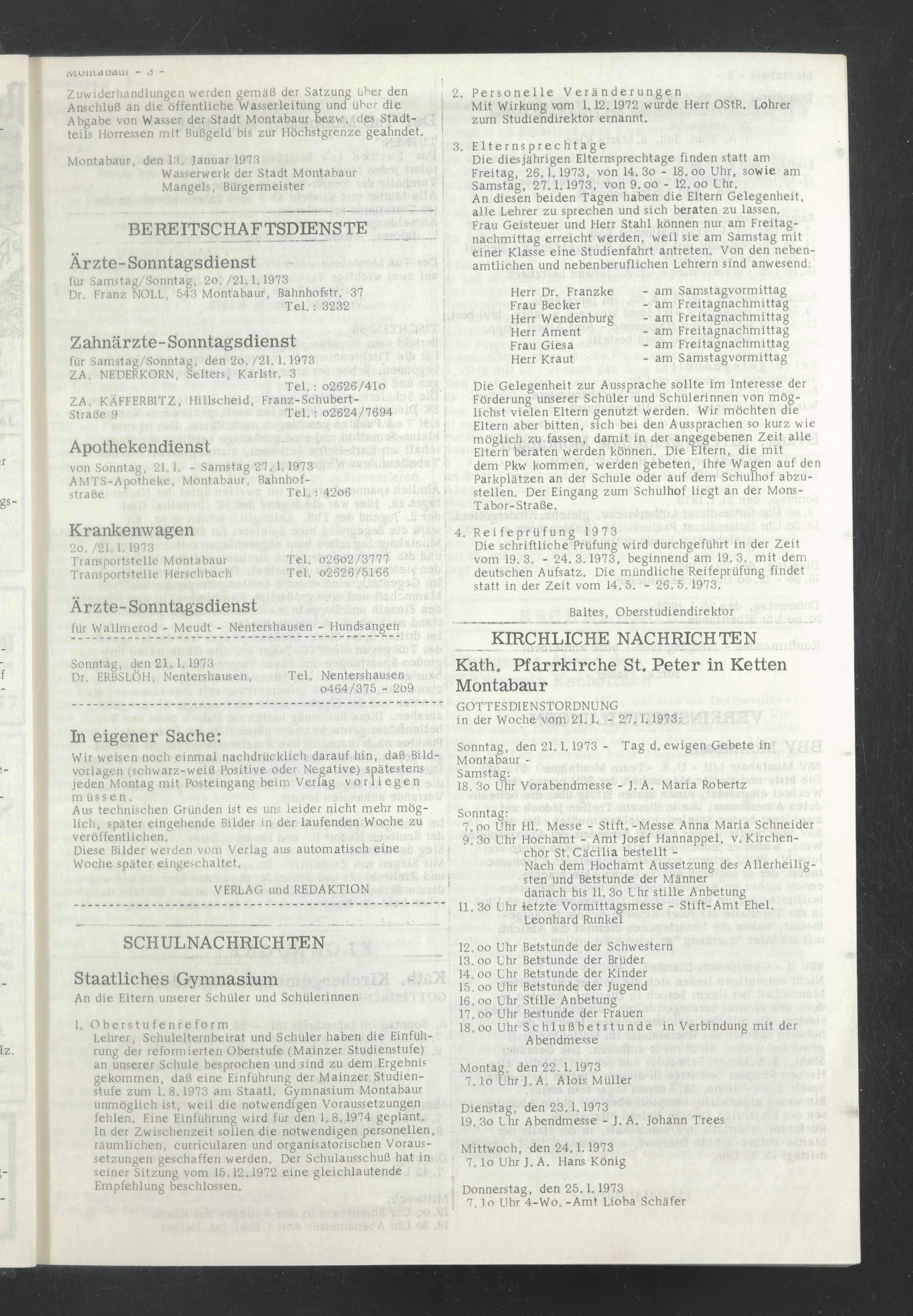 von Sonntag, 21.1. - Samstag 27. 1,1973 AMTS-Apotheke, Montabaur, Bahnhofstraße Tel. : 42o6
