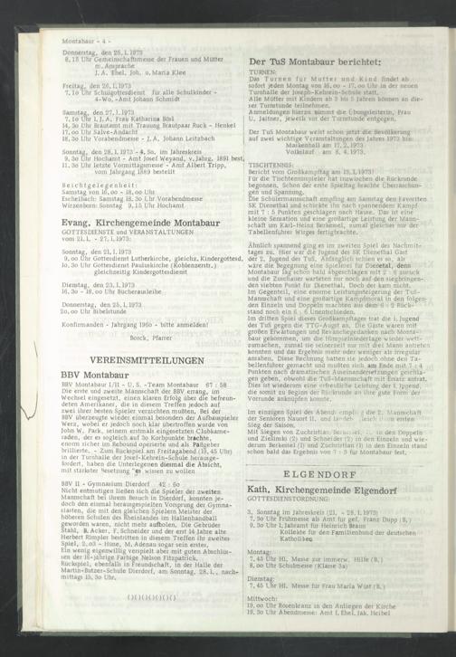 Sonntag, den 28.1.1973 - 4. So. im Jahres kreis 9. 3o Uhr Hochamt - Amt Josef Weyand, v. Jahrg. 1891 best, 11. 3o Uhr letzte Vormittagsmesse - Amt Albert Tripp, vom Jahrgang 1889 bestellt