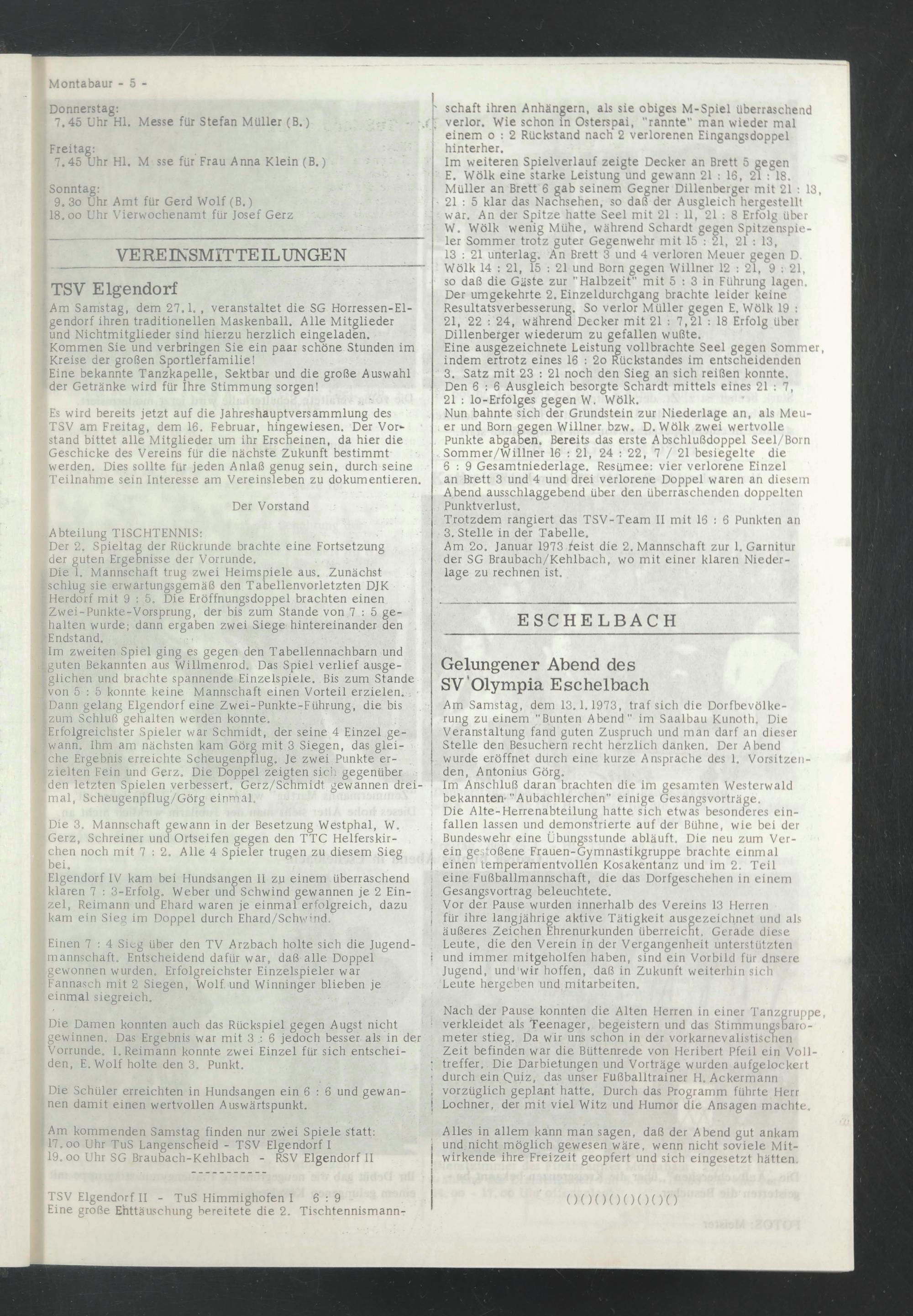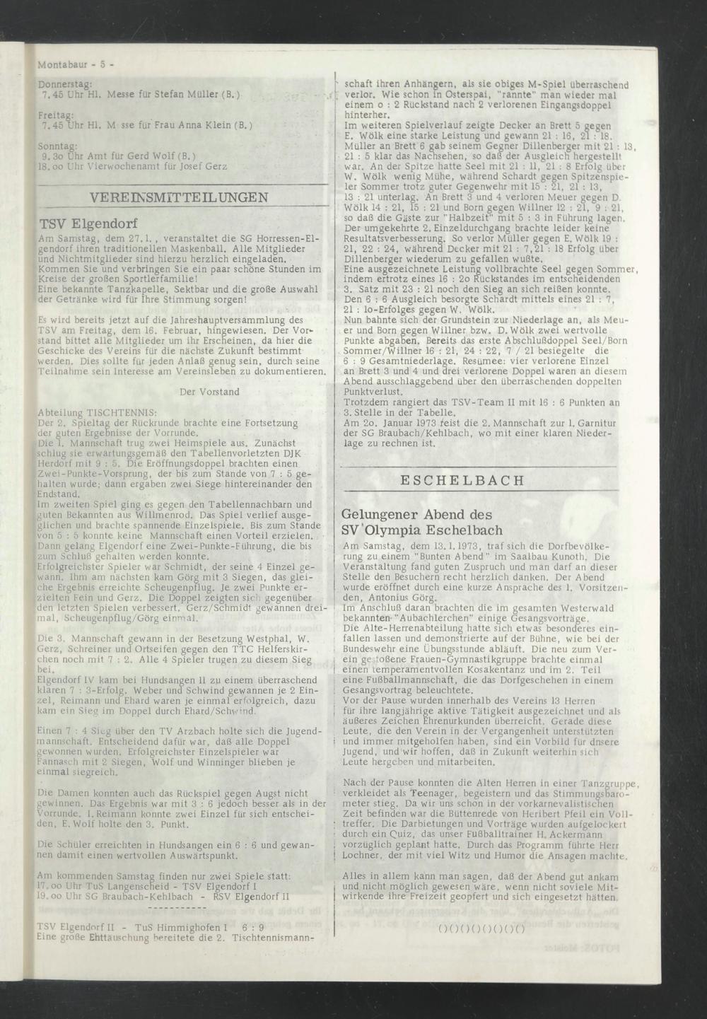 Am Samstag, dem 13.1.1973, traf sich die Dorfbevölkerung zu einem "Bunten Abend" im Saalbau Kunoth, Die Veranstaltung fand guten Zuspruch und man darf an dieser Stelle den Besuchern recht herzlich danken. Der Abend wurde eröffnet durch eine kurze Ansprache des 1. Vorsitzenden, Antonius Görg.