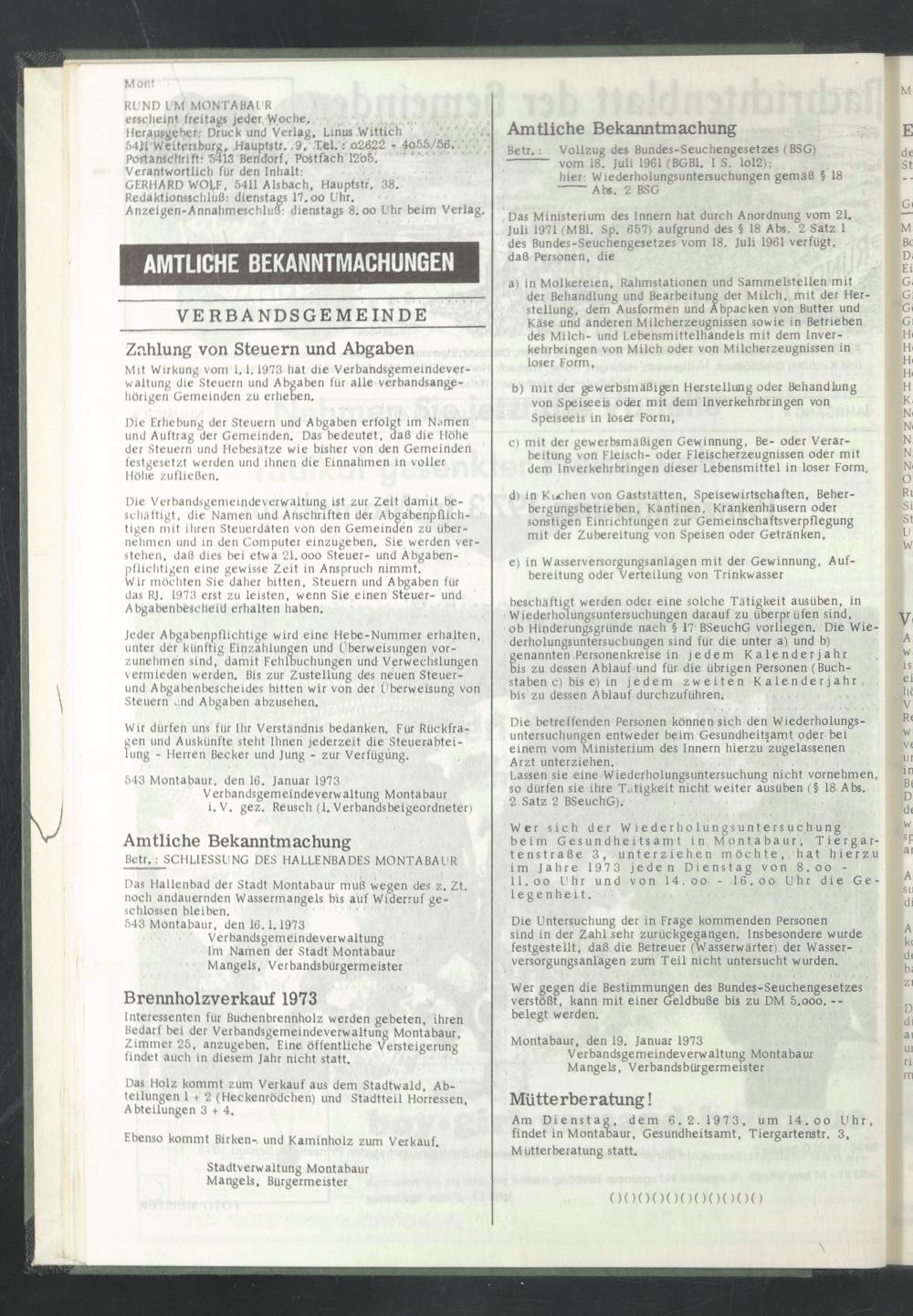 Am Dienstag, dem 6. 2.1973, um 14.oo Uhr, findet in Montabaur, Gesundheitsamt, Tiergartenstr. 3, Mütterberatung statt.