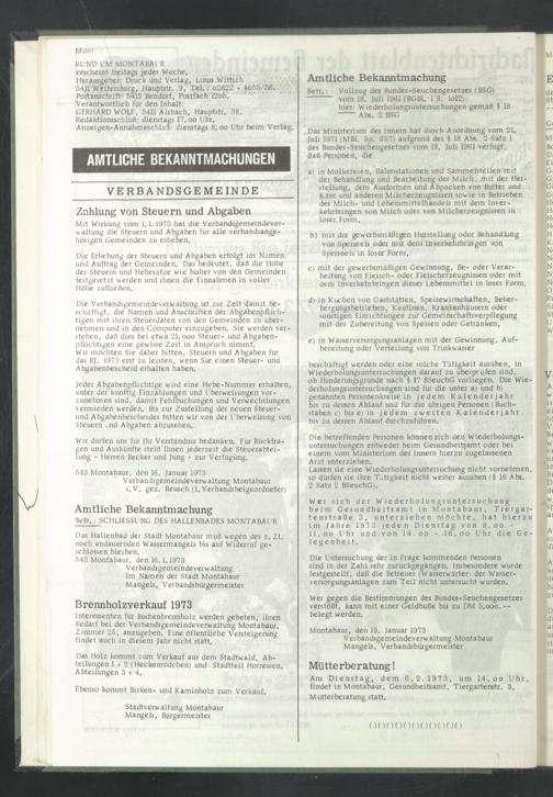 Mit Wirkung vom 1. 1,1973 hat die Verbandsgemeindever- waltung die Steuern und Abgaben für alle verbandsangehörigen Gemeinden zu erheben.