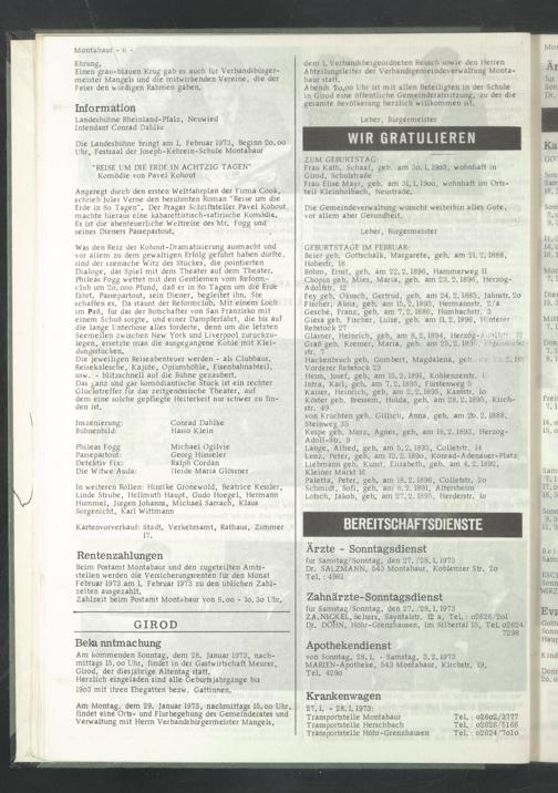 Am kommenden Sonntag, dem 28. Januar 1973, nachmittags 15.oo Uhr, findet in der Gastwirtschaft Meurer, Girod, der diesjährige Altentag statt.