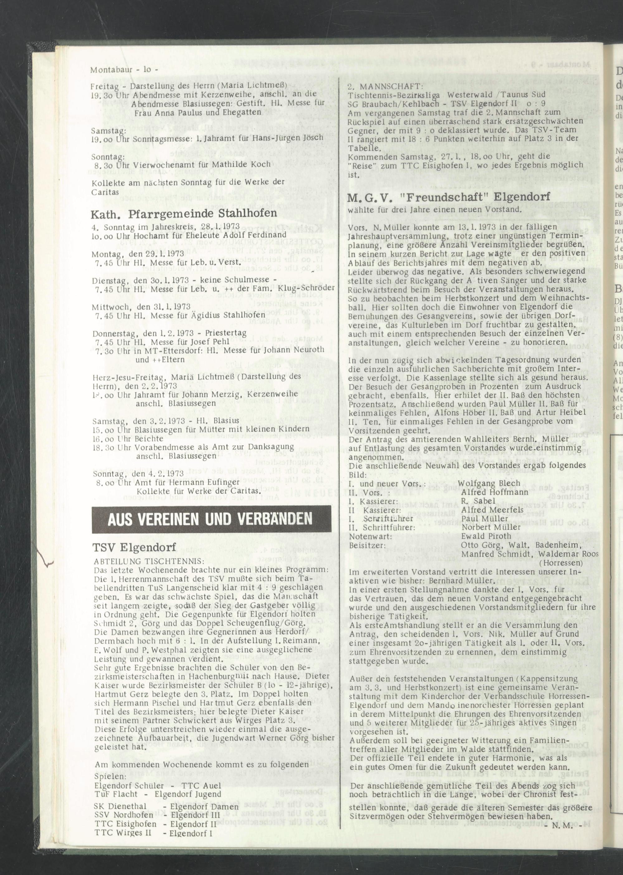 Vors. N. Müller konnte am 13.1.1973 in der fälligen Jahreshauptversammlung, trotz einer ungünstigen Terminplanung, eine größere Anzahl Vereinsmitglieder begrüßen. In seinem kurzen Bericht zur Lage wägte er den positiven Ablauf des Berichtsjahres mit dem negativen ab.