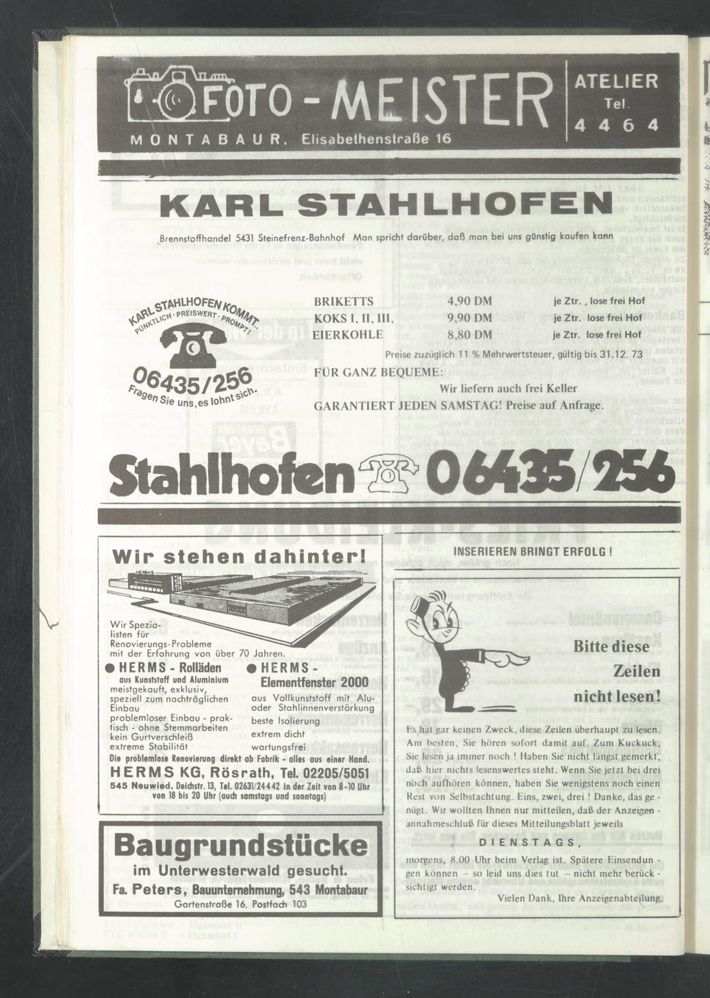 Hs hat gar keinen Zweck, diese Zeilen überhaupt zu lesen. Am besten, Sie hören sofort damit auf. Zum Kuckuck, Sie lesen ja immer noch ! Haben Sie nicht längst gemerkt, daß hier nichts lesenswertes steht. Wenn Sie jetzt bei drei nöeh aufhören können, haben Sie wenigstens noch einen Rest von Selbstachtung. Eins, zwei, drei ! Danke, das ge - nügt. Wir wollten Ihnen nur mitteilen, daß der Anzeigen - annahmeschluß für dieses Mitteilungsblatt jeweils