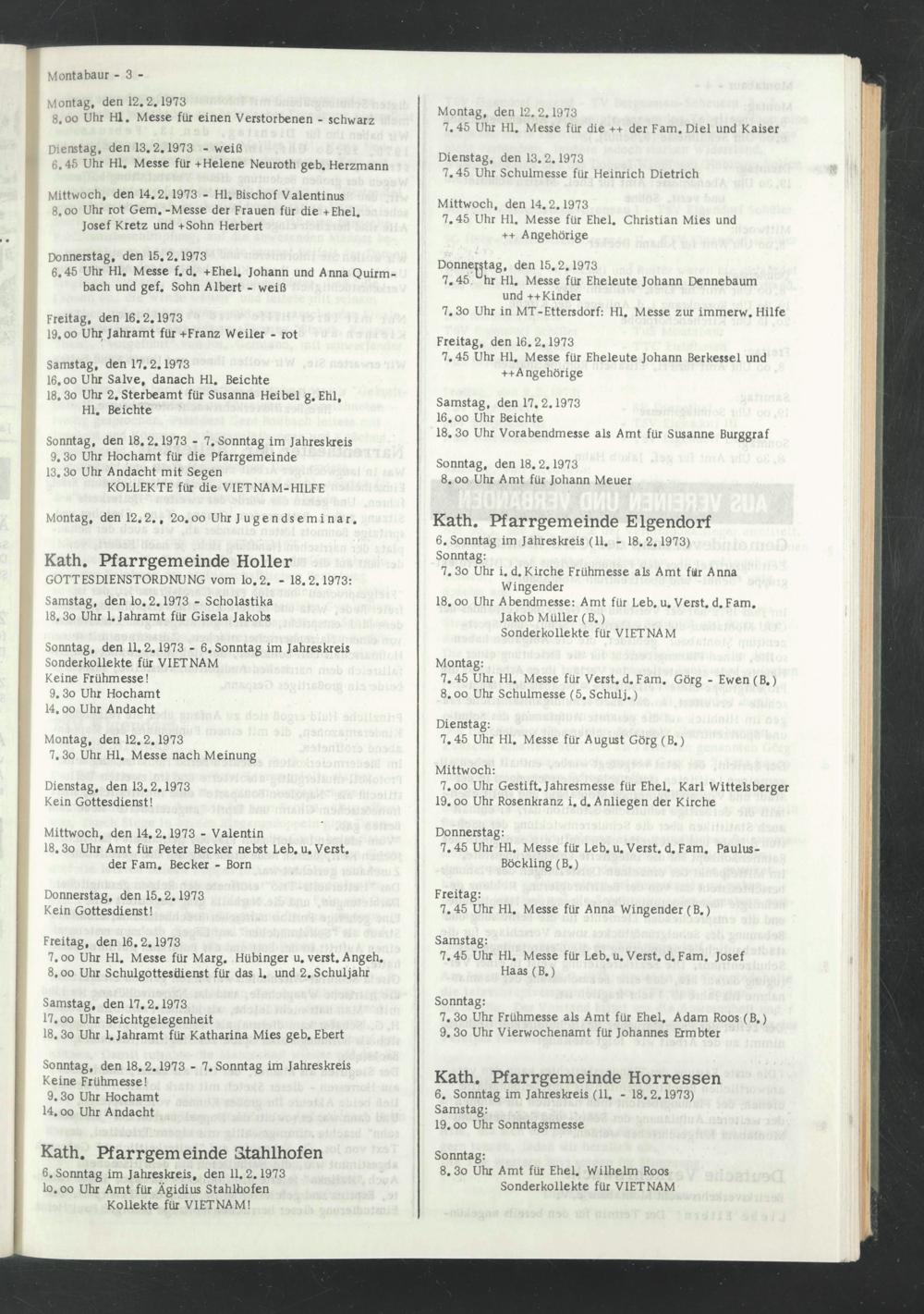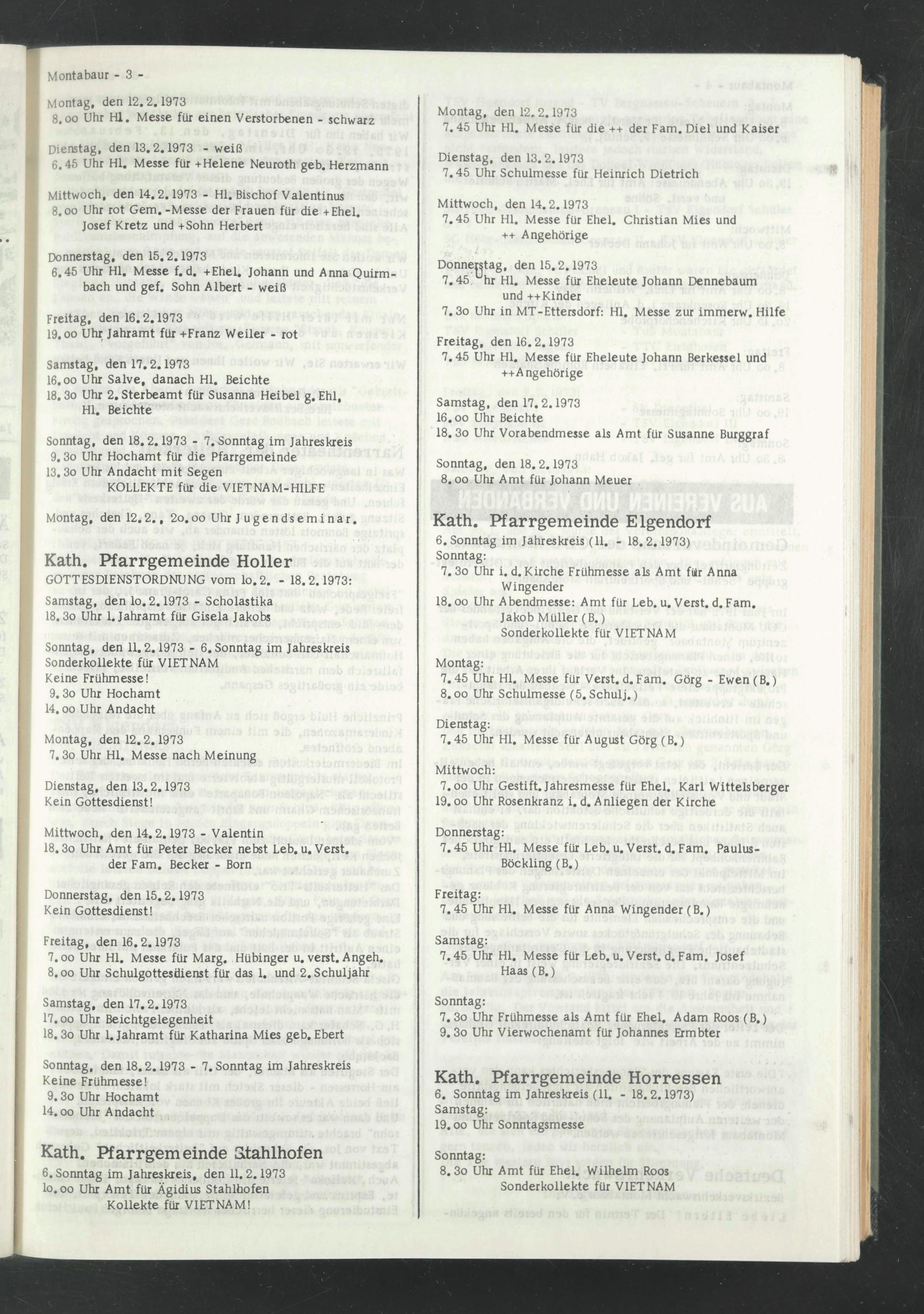 6 . Sonntag im Jahreskreis, den 11.2.1973 lo.oo Uhr Amt für Ägidius Stahlhofen Kollekte für VIETNAM!