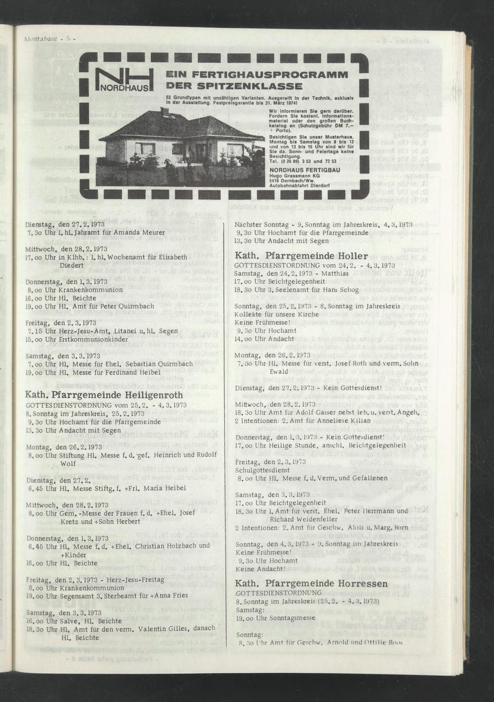 GOTTESDIENSTORDNUNG vom 24.2. - 4.3. 1973 Samstag, den 24.2. 1973 - Matthias 17.oo Uhr Beichtgelegenheit