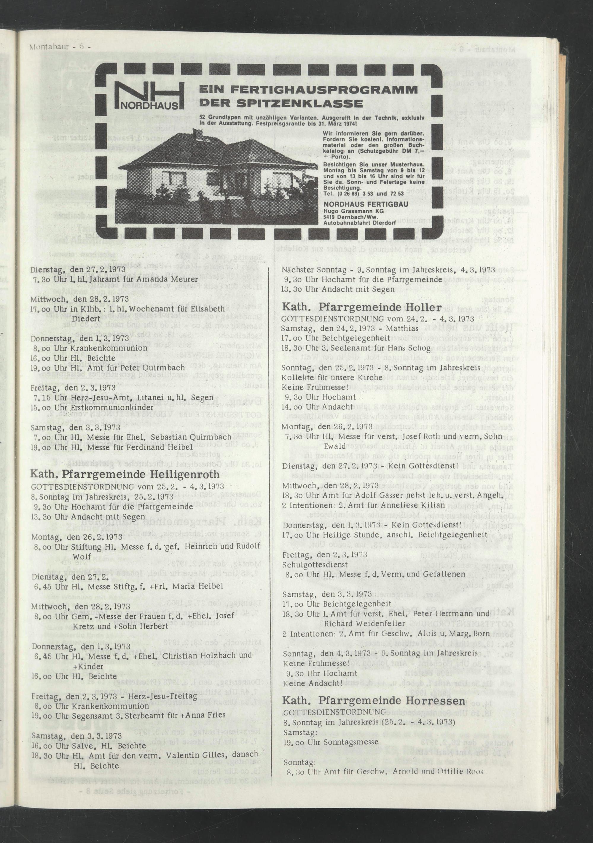 Donnerstag, den 1.3.1973 8 . oo Uhr Krankenkommunion I 6.00 Uhr Hl. Beichte 19.oo Uhr Hl. Amt für Peter Quirmbach