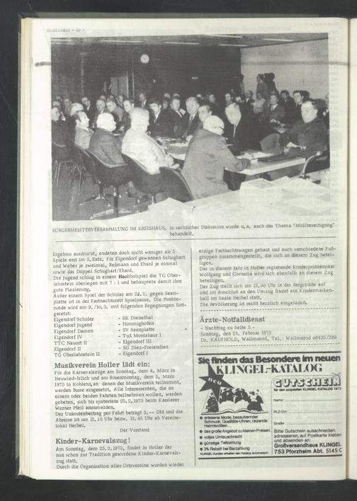 Für die Karnevalszüge am Sonntag, dem 4. März in Neuwied-Irlich und am Rosenmontag, dem 5. März 1973 in Koblenz; an denen der Musikverein teilnimmt, werden Busse eingesetzt. Alle Interessenten, die an einem oder beiden Fahrten teilnehmen wollen, werden gebeten, sich bis spätestens 25.2.1973 beim Kassierer Werner Pfeil anzumelden.