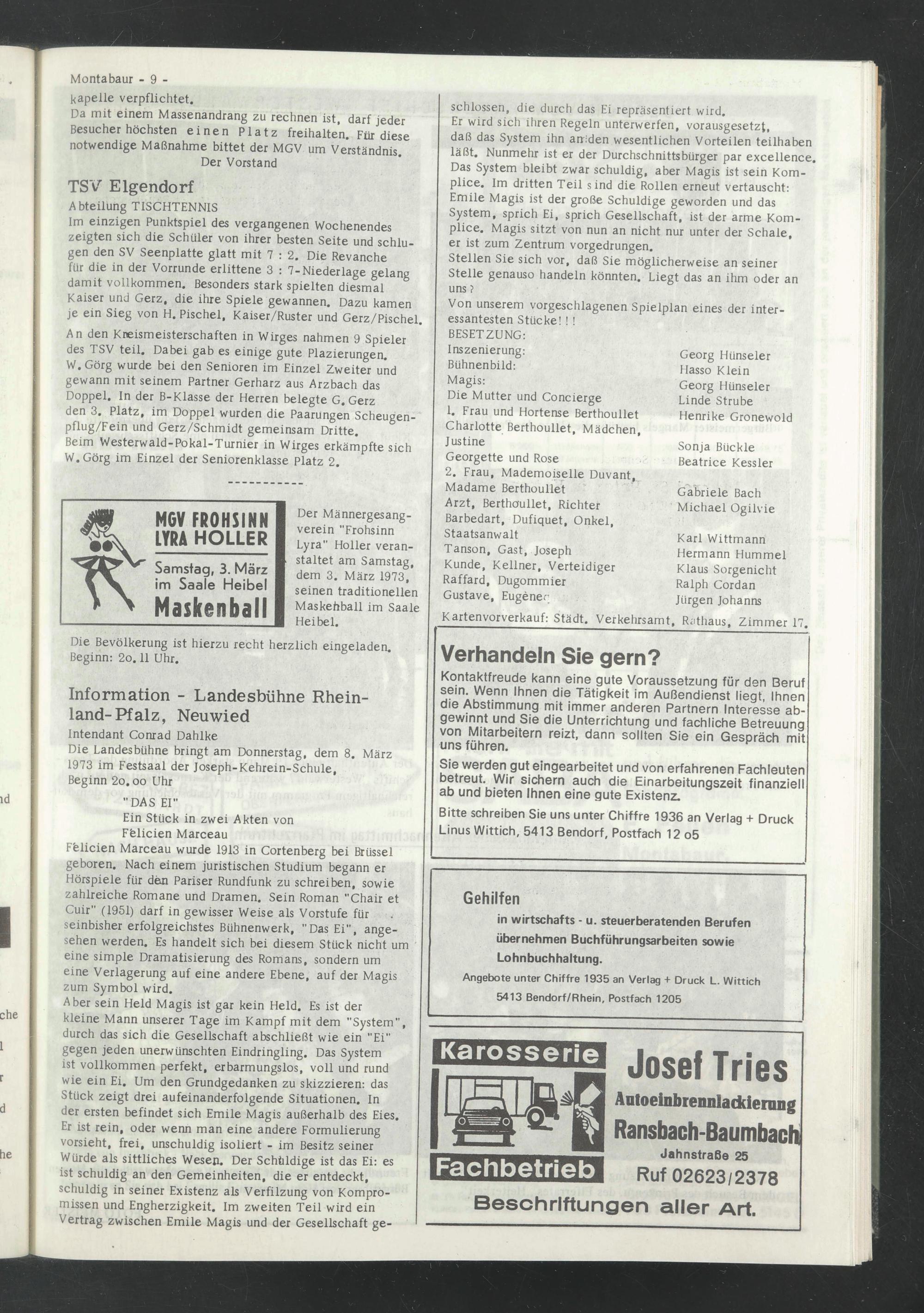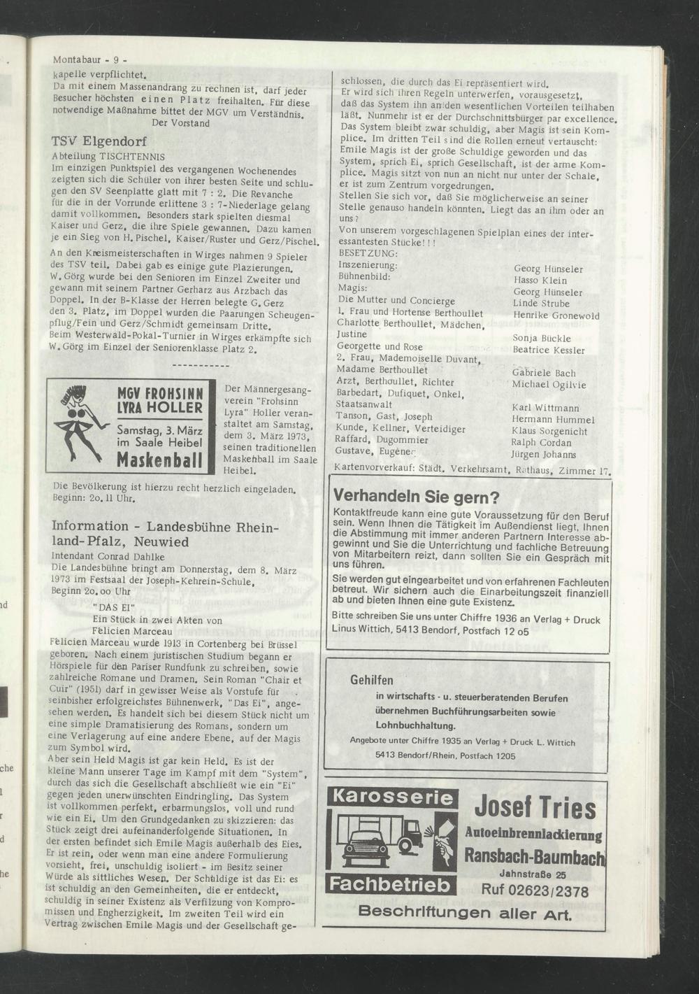 Der Männergesangverein "Frohsinn Lyra" Holler veranstaltet am Samstag, dem 3. März 1973, seinen traditionellen Maskehball im Saale Heibel.