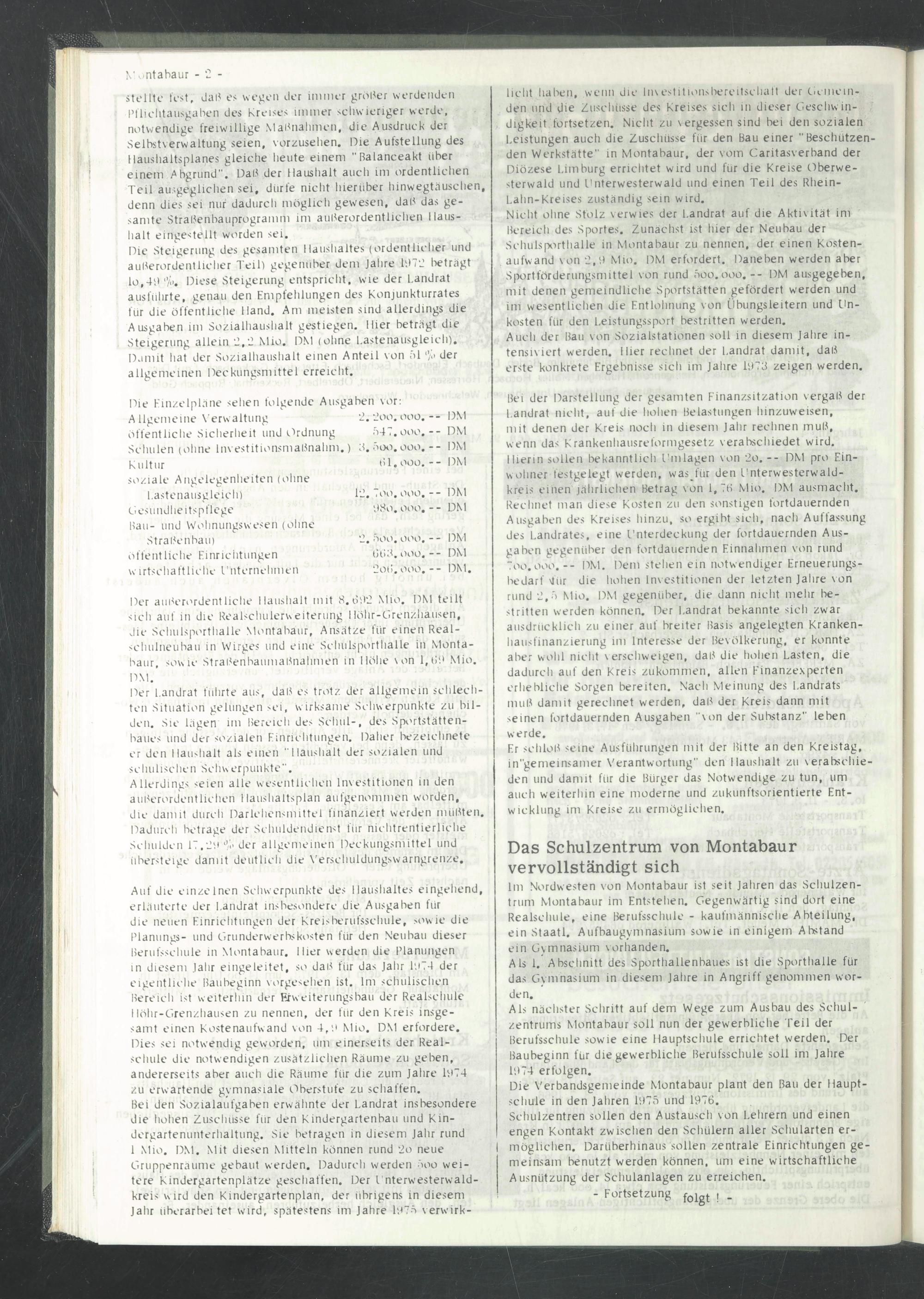 Auf die einzelnen Schwerpunkte des Haushaltes eingehend, erläuterte der Landrat insbesondere die Ausgaben für die neuen Einrichtungen der Kreisberufsscluile, sowie die Planungs- und Grunderwerbskosten für den Neubau dieser Berufsschule in Montabaur. Hier werden die Planungen in diesem Jahr eingeleitet, so daß für das Jahr 1*374 der eigentliche Baubeginn vorgesehen ist. Im schulischen Bereich ist weiterhin der Erweiterungsbau der Realschule Höhr-Grenzhausen zu nennen, der für den Kreis insgesamt einen Kostenaufwand von 4,9 Mio. DM erfordere.
