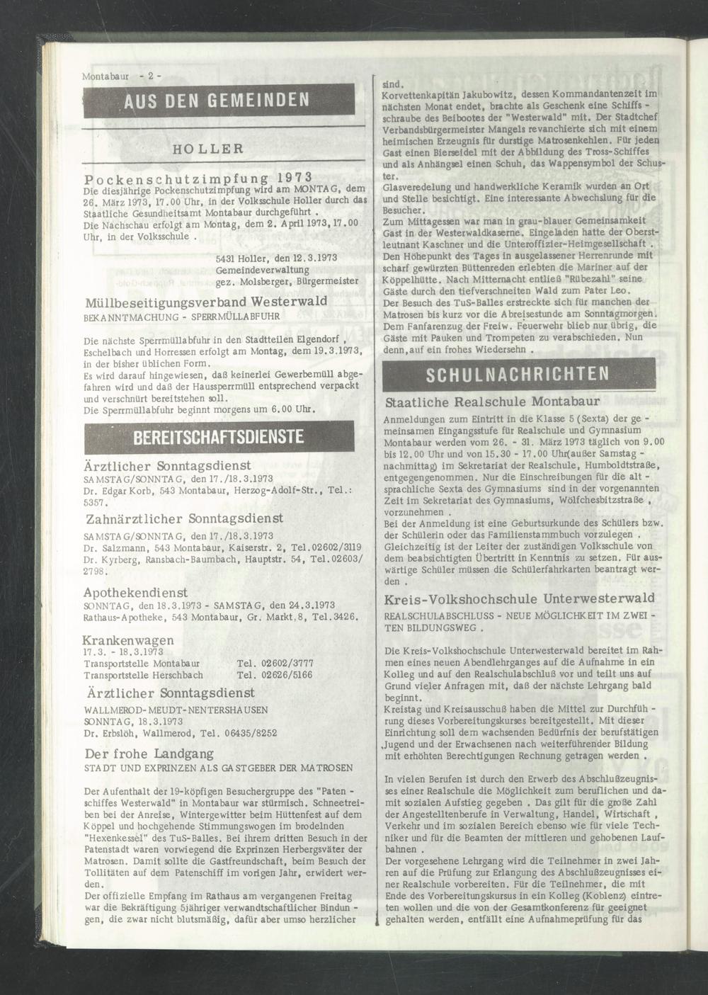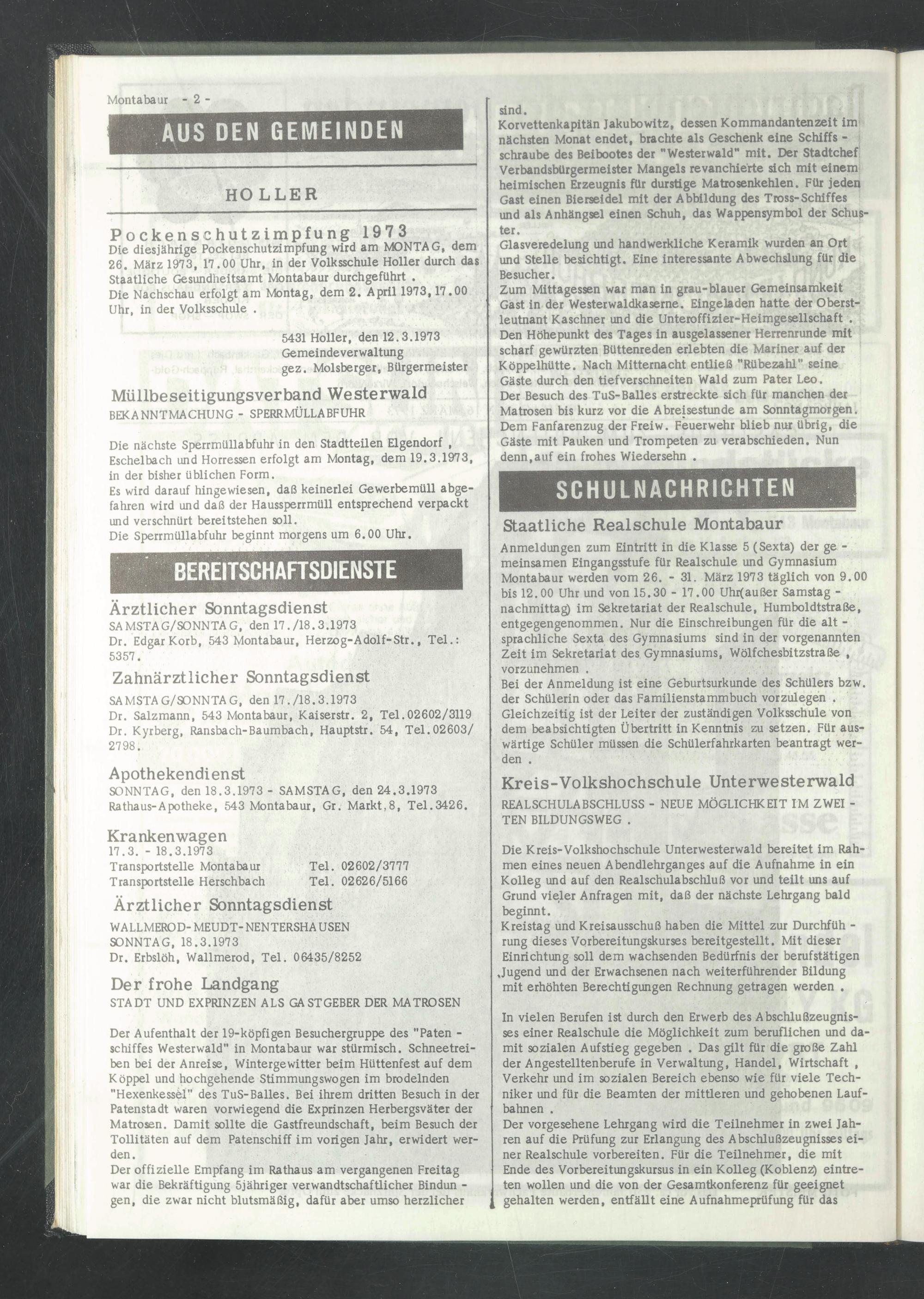 Die diesjährige Pockenschutzimpfung wird am MONTA G, dem 26. März 1973, 17.00 Uhr, in der Volksschule Holler durch das Staatliche Gesundheitsamt Montabaur durchgeführt .