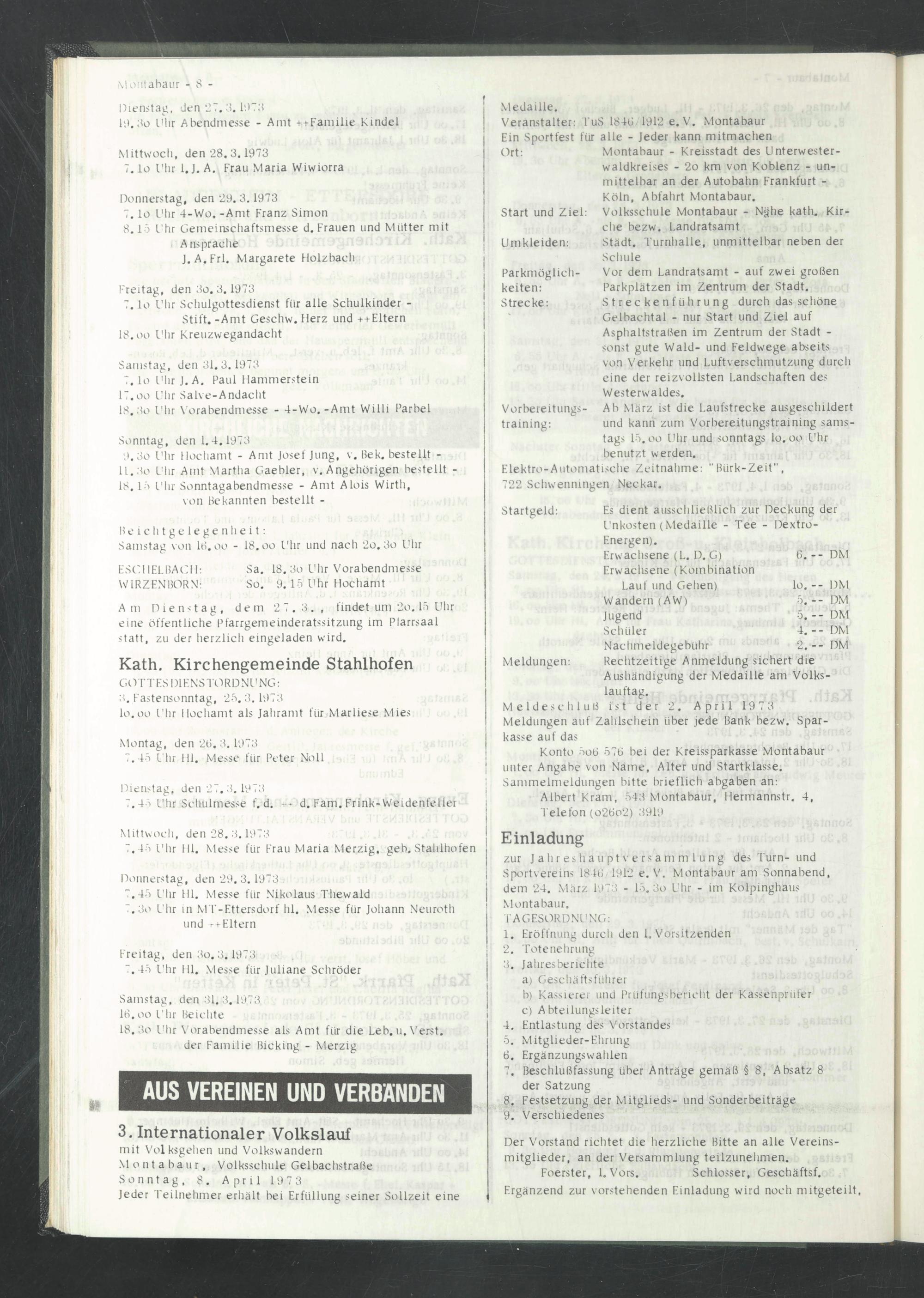 zur Jahreshauptversammlung des Turn- und Sportvereins 1848 1912 e. V. Montabaur am Sonnabend, dem 24. März 1973 - 15. 3o Uhr - im Kolpinghaus Montabaur.