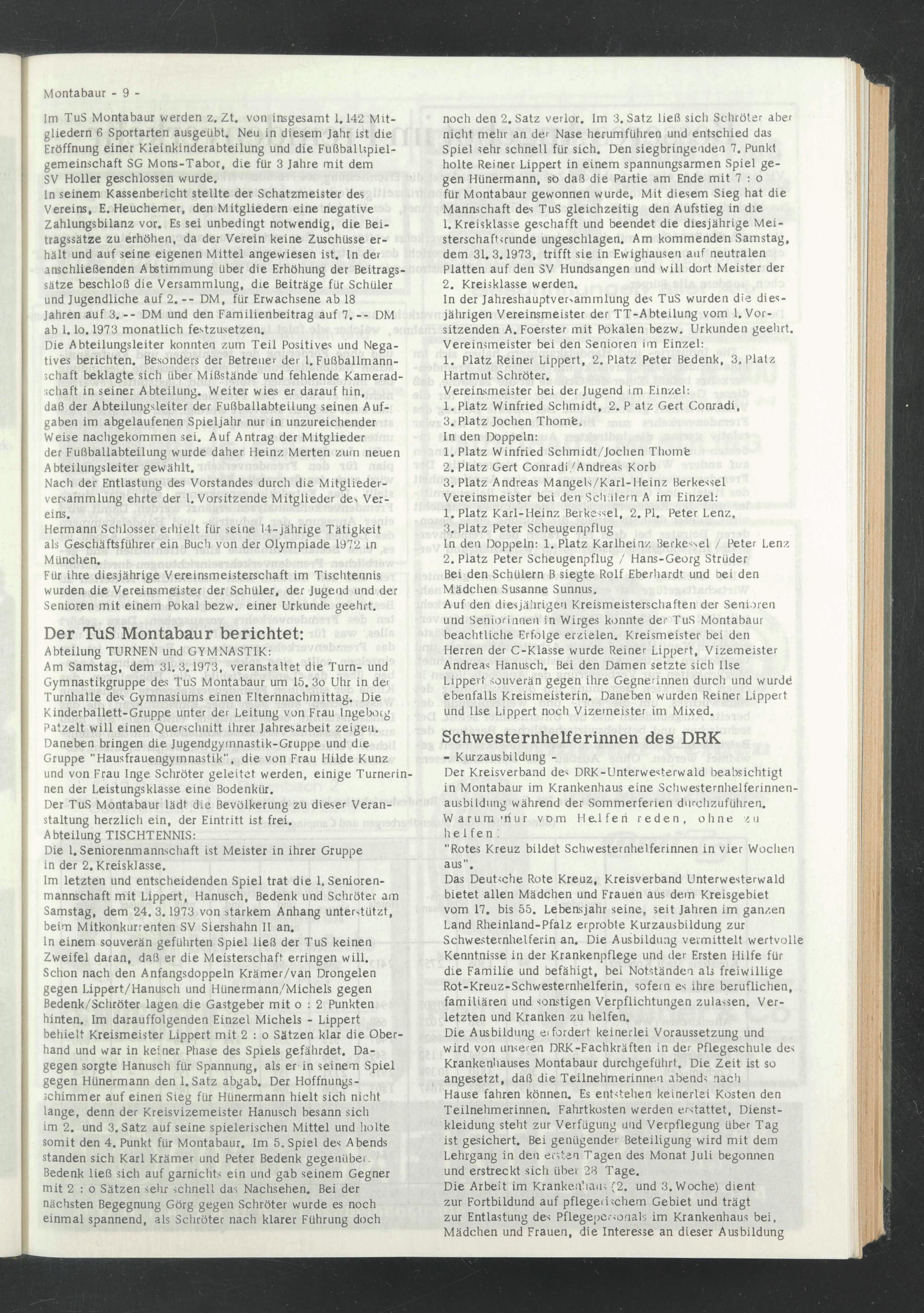 Am Samstag, dem 31.3.1973, veranstaltet die Turn- und Gymnastikgruppe des TuS Montabaur um 15. 3o Uhr in der Turnhalle des Gymnasiums einen Elternnachmittag. Die Kinderballett-Gruppe unter der Leitung von Frau Ingebocg Patzelt will einen Querschnitt ihrer Jahresarbeit zeigen. Daneben bringen die Jugendgymnastik-Gruppe und die Gruppe "Hausfrauengymnastik'’, die von Frau Hilde Kunz und von Frau Inge Schröter geleitet werden, einige Turnerinnen der Leistungsklasse eine Bodenkür.