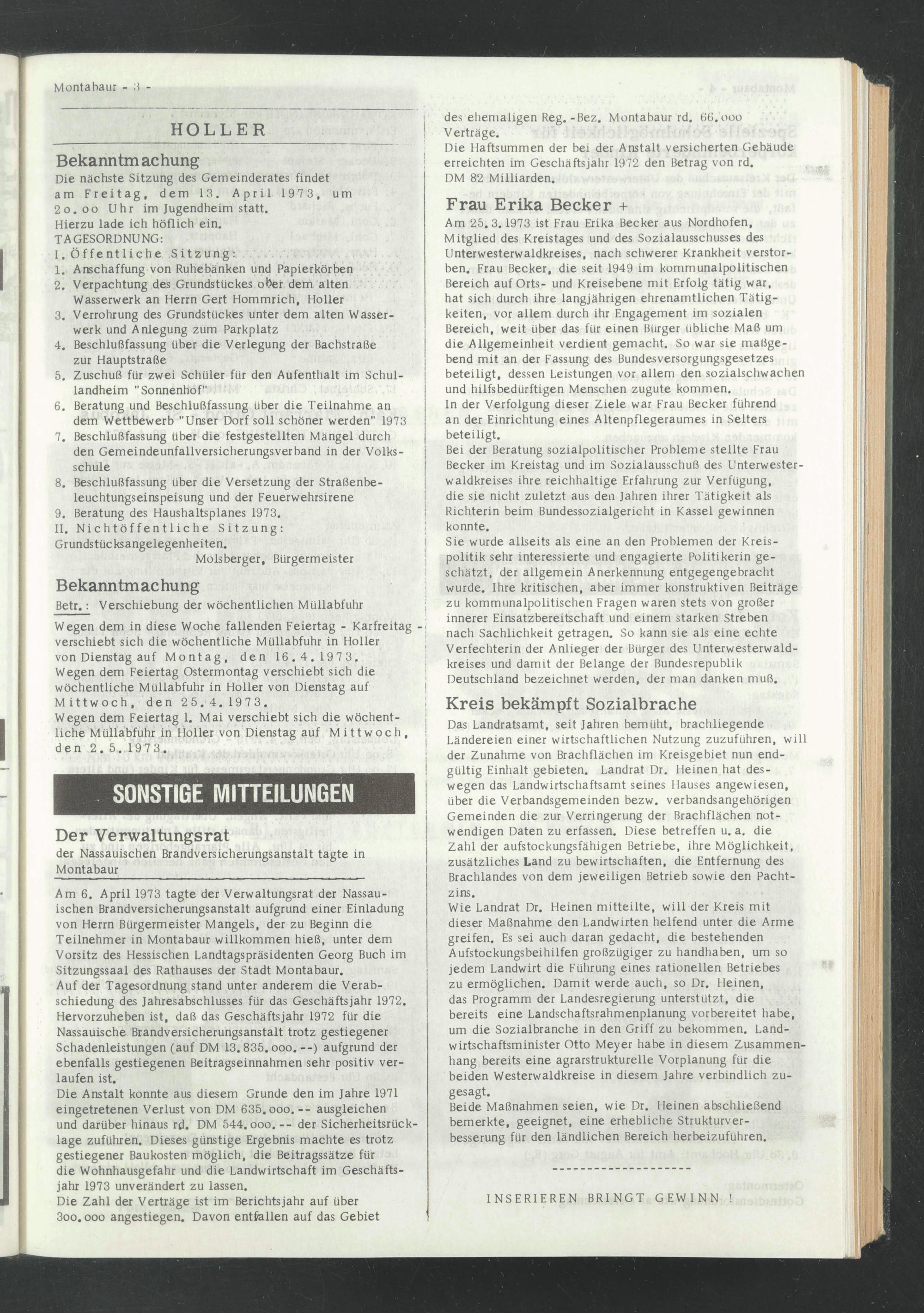 Wegen dem in diese Woche fallenden Feiertag - Karfreitag -; verschiebt sich die wöchentliche Müllabfuhr in Holler von Dienstag auf Montag, den 16.4.1973.