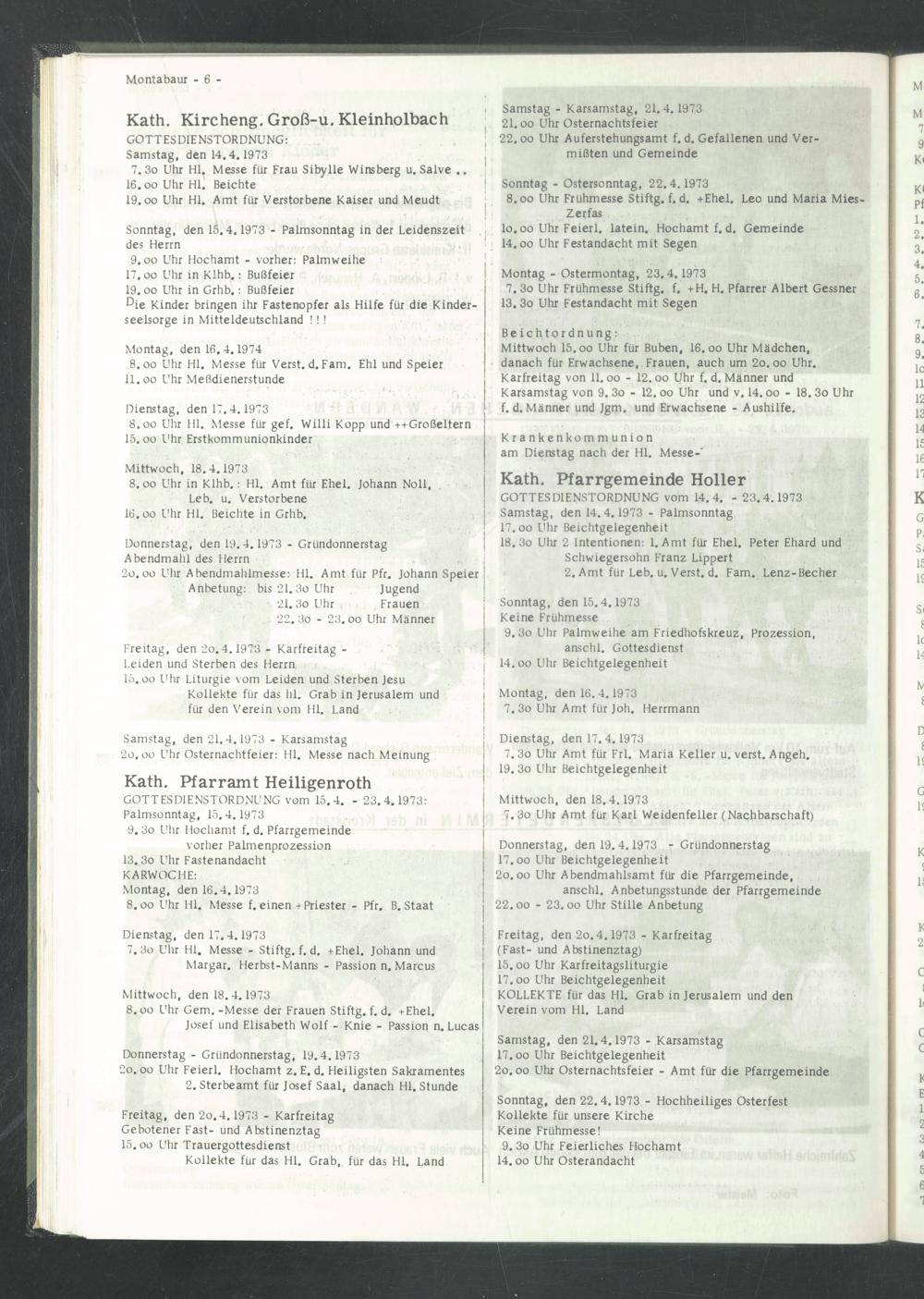 GOTTESDIENSTORDNUNG vom 15.4. - 23.4.1973: Palmsonntag, 15.4.1973 9. 3o Uhr Hochamt f. d. Pfarrgemeinde vorher Palmenprozession 13. 3o Uhr Fastenandacht KARWOCHE: