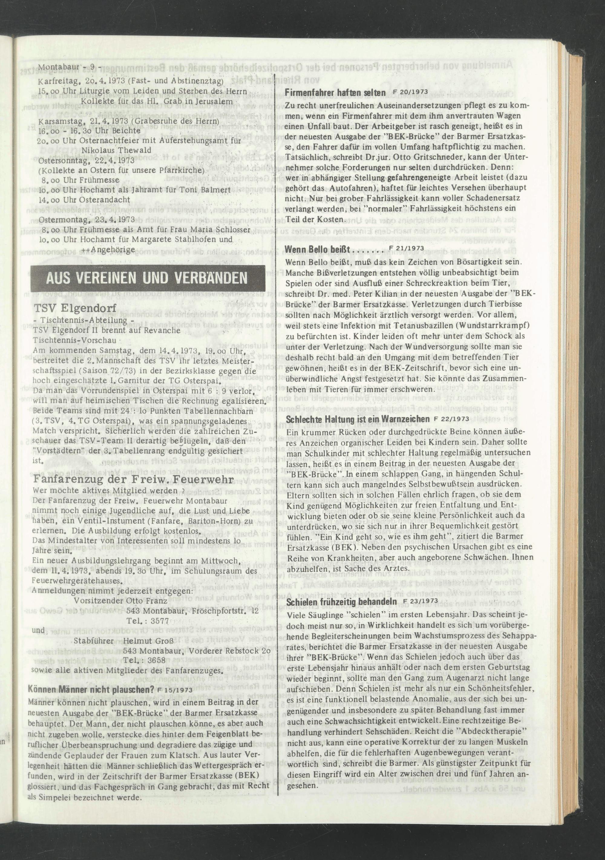 Ein neuer Ausbildungslehrgang beginnt am Mittwoch, dem 11.4.1973, abends 19. 3o Uhr, im Schulungsraum des F euerwehrgerätehauses.