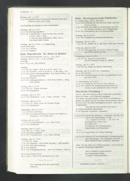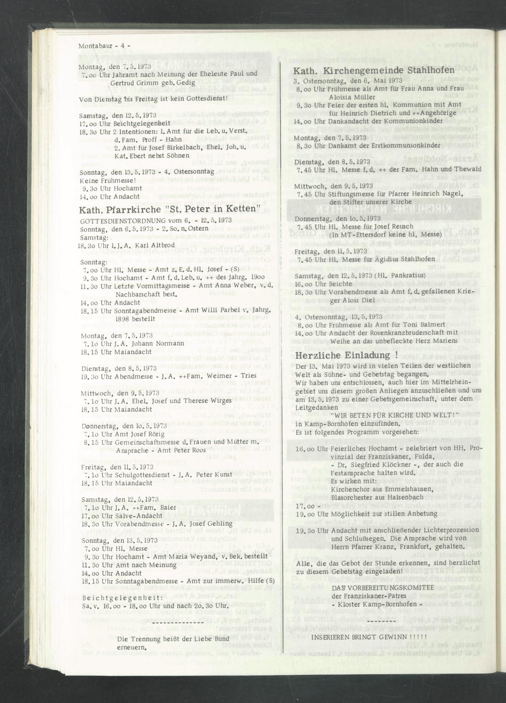 7.45 Uhr Hl. Messe f. d. ++ der Farn. Hahn und Thewald Mittwoch, den 9. 5.1973