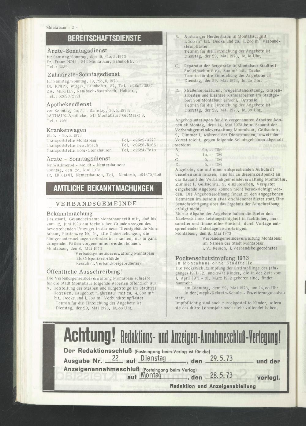 Angebotsunterlagen für die vorgenannten Arbeiten können ab Montag, dem 14. Mai 1973 beim Bauamt der Verbandsgemeindeverwaltung Montabaur, Gelbachstr.
