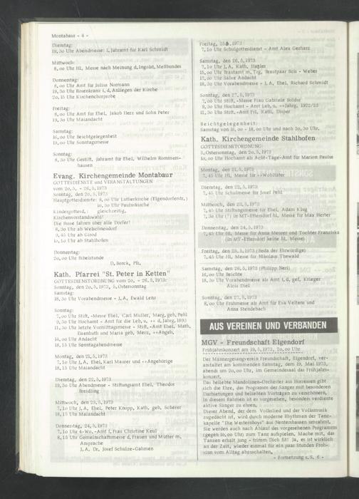 Sonntag, den 27.5.1973 7.oo Uhr Stift. -Messe Frau Gabriele Boldur 9. 3o Uhr Hochamt - Amt Leb. u. ++Jahrg. 1922/23 11. 3o Uhr Stift.-Amt Frl. Kath. Disper
