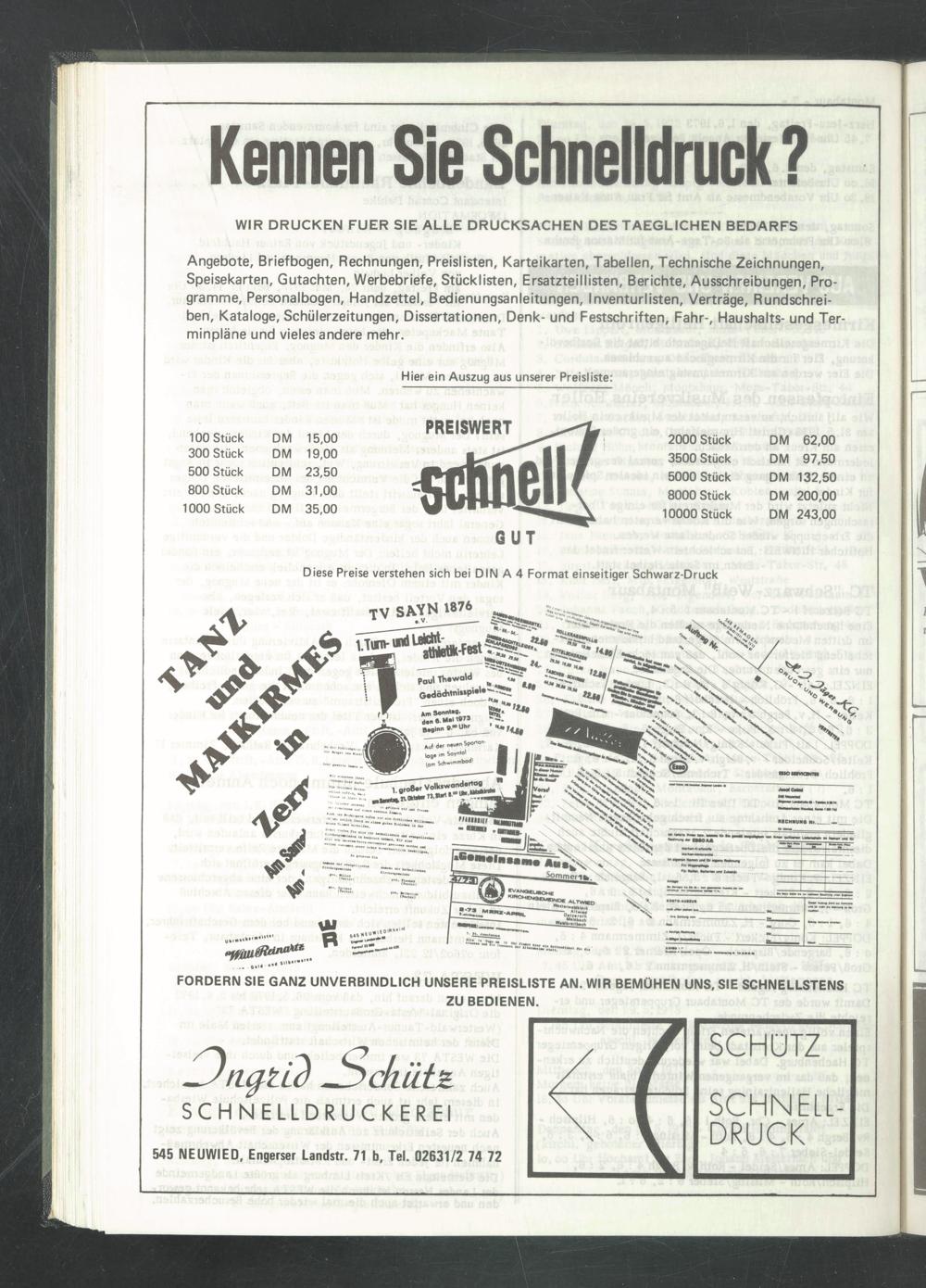 Angebote, Briefbogen, Rechnungen, Preislisten, Karteikarten, Tabellen, Technische Zeichnungen, Speisekarten, Gutachten, Werbebriefe, Stücklisten, Ersatzteillisten, Berichte, Ausschreibungen, Programme, Personalbogen, Handzettel, Bedienungsanleitungen, Inventurlisten, Verträge, Rundschreiben, Kataloge, Schülerzeitungen, Dissertationen, Denk- und Festschriften, Fahr-, Haushalts- und Terminpläne und vieles andere mehr.