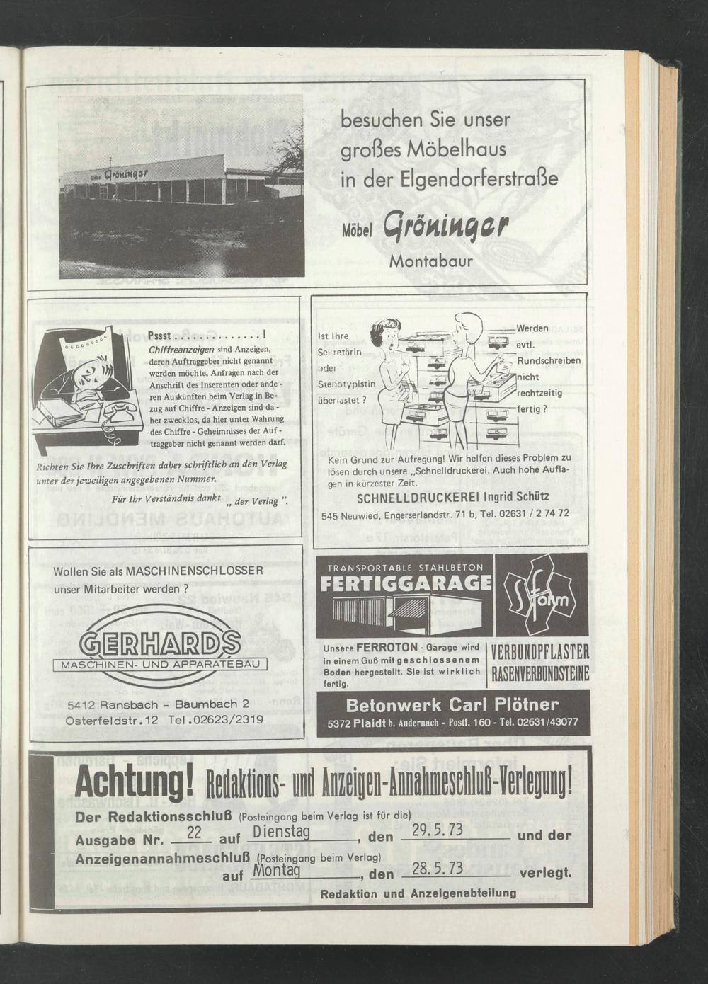Anzeigenannahmeschluß (Posteingang beim Verlag)