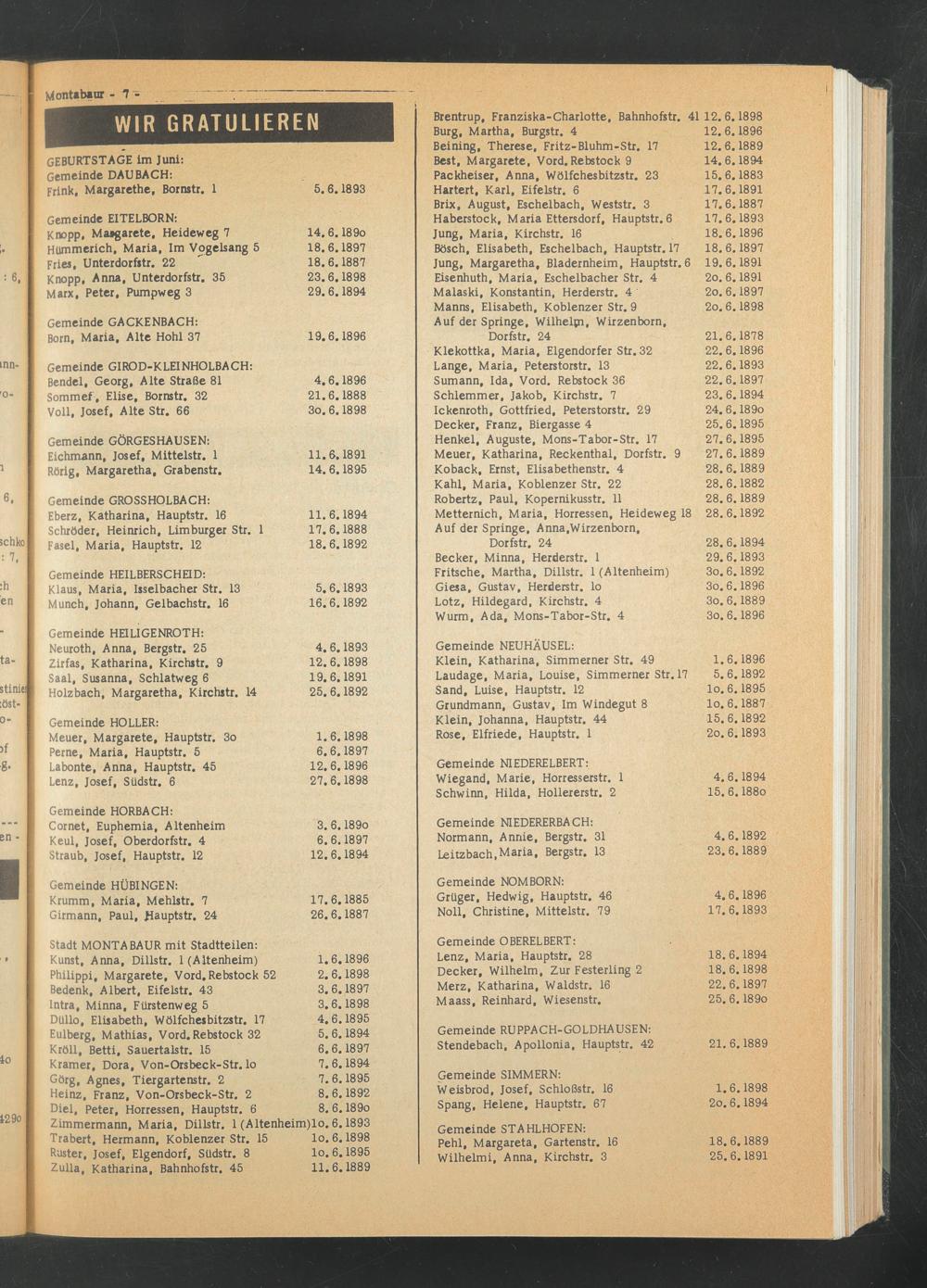 Lenz, Maria, Hauptstr. 28 Decker, Wilhelm, Zur Festerling 2 Merz, Katharina, Waldstr. 16 Maass, Reinhard, Wiesenstr.