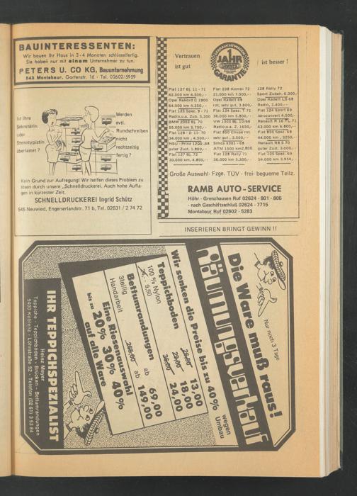 128 Rally 72 Sport Zubeh. 6.300,' Opel Kadett LS 68 Radio, 3.400,-- Fiat 124 Sport 69 Idroconvert 4.500,- Renault R 16 Tl 71 43.000 km 6.800,- • Fiat 850 Spez. 69 44.0 00 km , 325 0,- • Renault R8 S 70 guter Zust. 3.000,- -