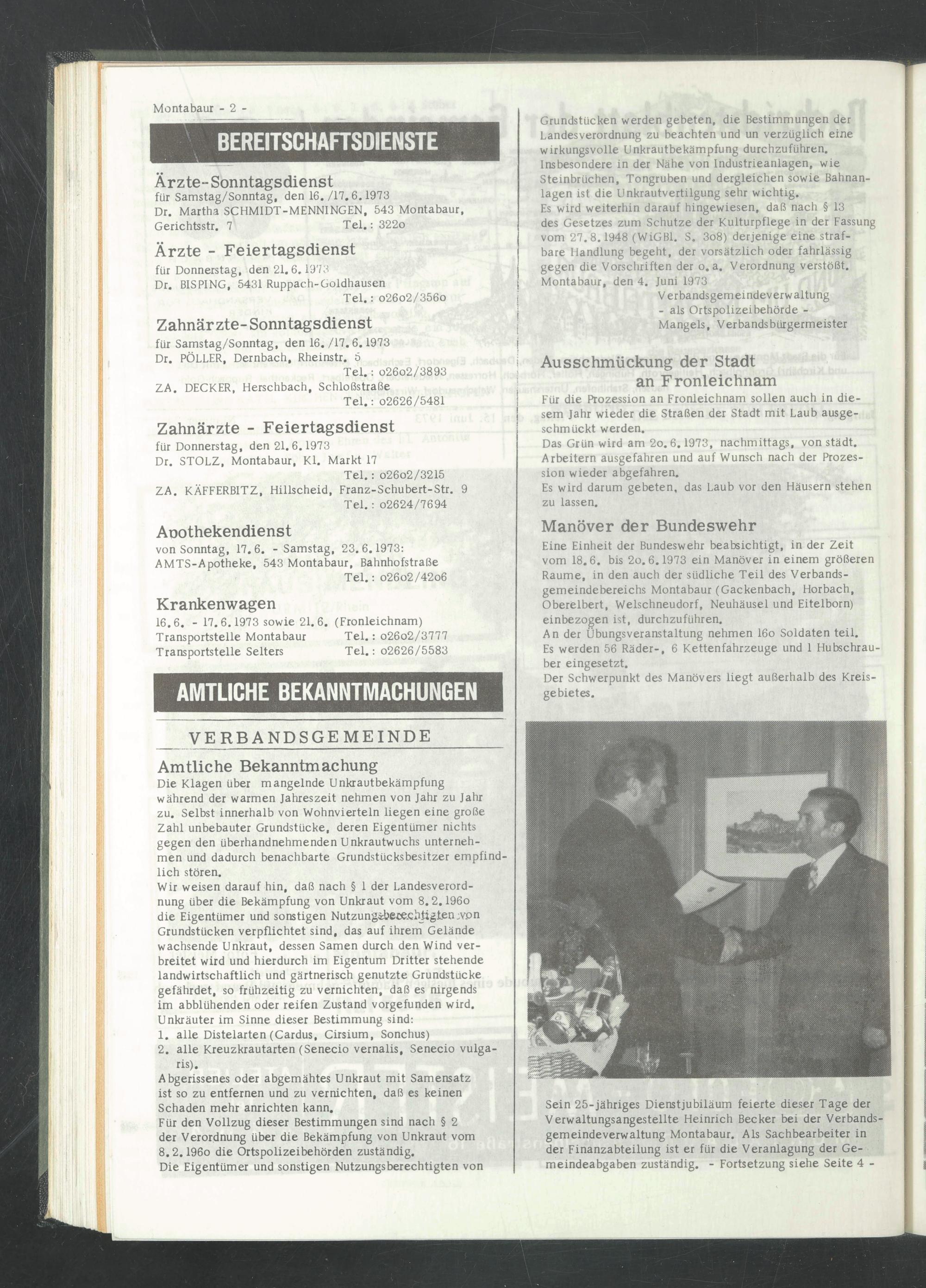 Eine Einheit der Bundeswehr beabsichtigt, in der Zeit vom 18.6. bis 2o. 6.1973 ein Manöver in einem größeren Raume, in den auch der südliche Teil des Verbandsgemeindebereichs Montabaur (Gackenbach, Horbach, Oberelbert, Welschneudorf, Neuhäusel und Eitelborn) einbezogen ist, durchzuführen.