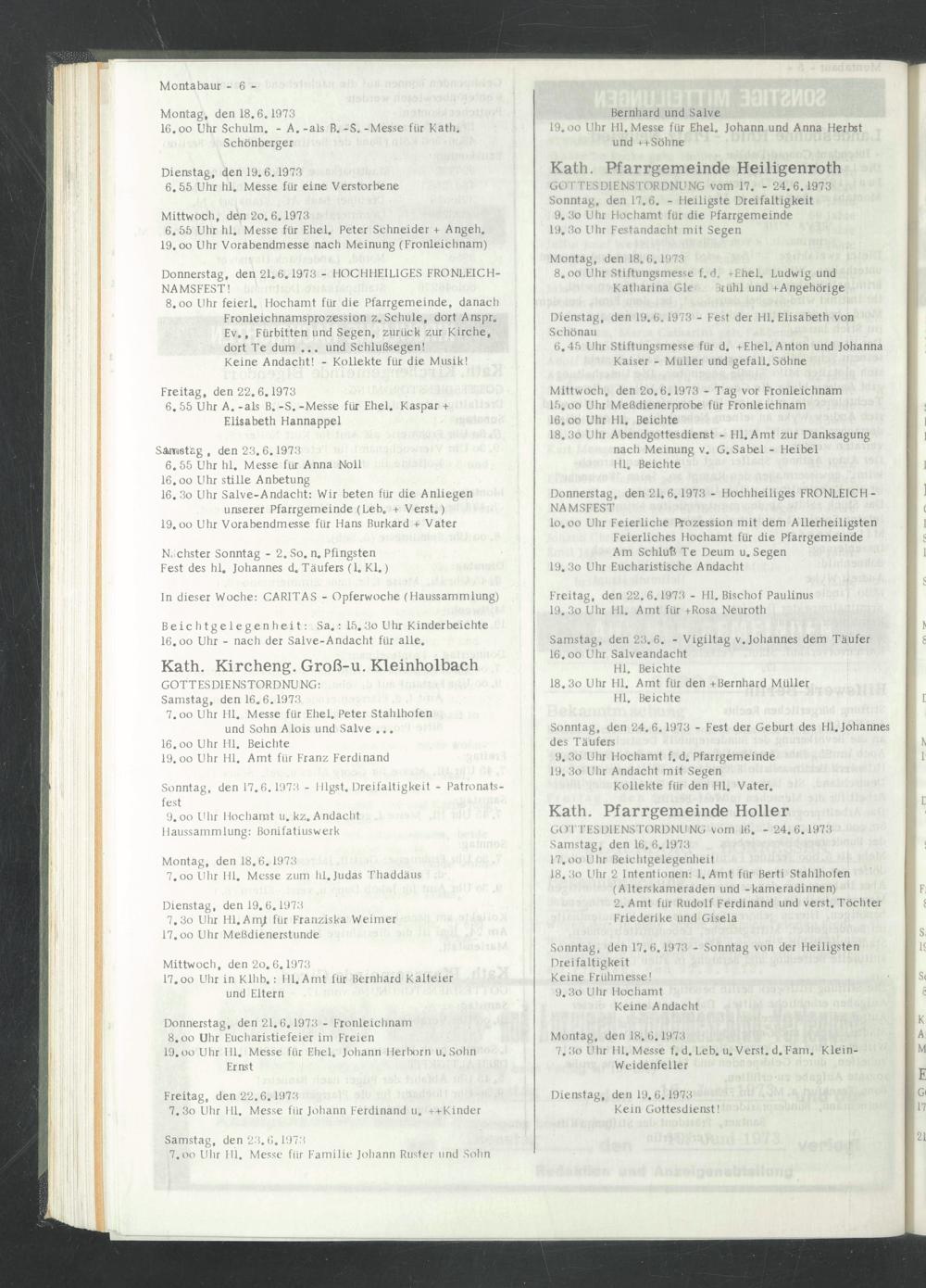 Donnerstag, den 21.6.1973 - Fronleichnam 8.oo Uhr Eucharistiefeier im Freien 19.00 Uhr Hl. Messe für Ehel. Johann Herborn u. Sohn Ernst