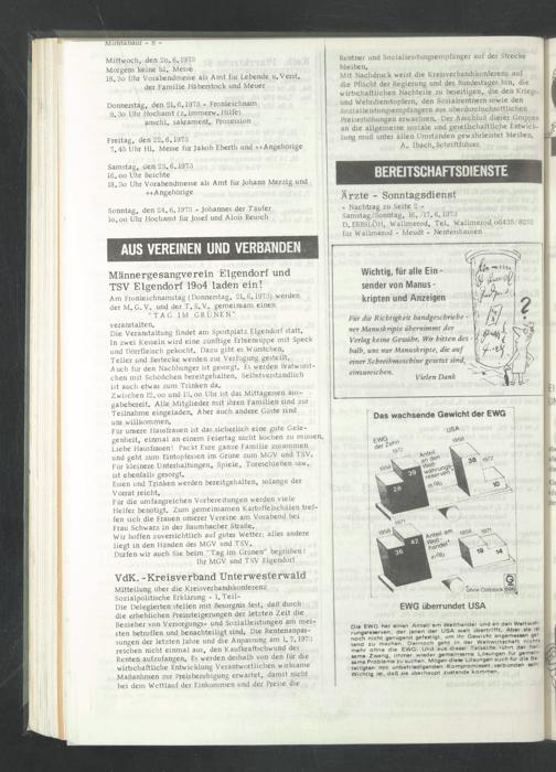 Am Fronleichnamstag (Donnerstag, 21.6.1973) werden der M. G. V. und der T. S. V. gemeinsam einen "TAG IM GRÜNEN" veranstalten.