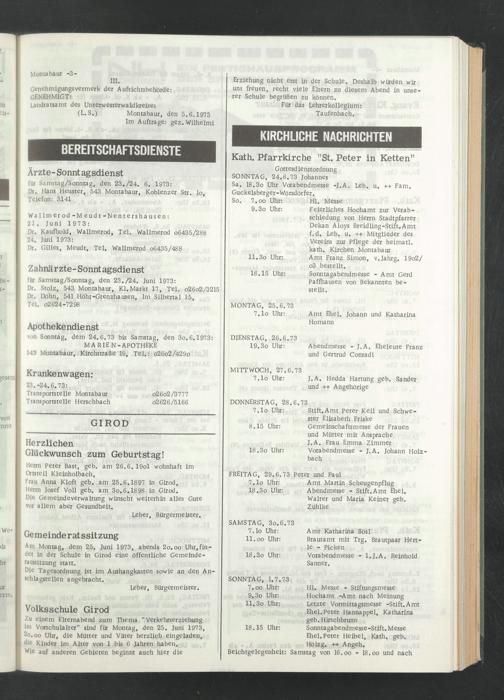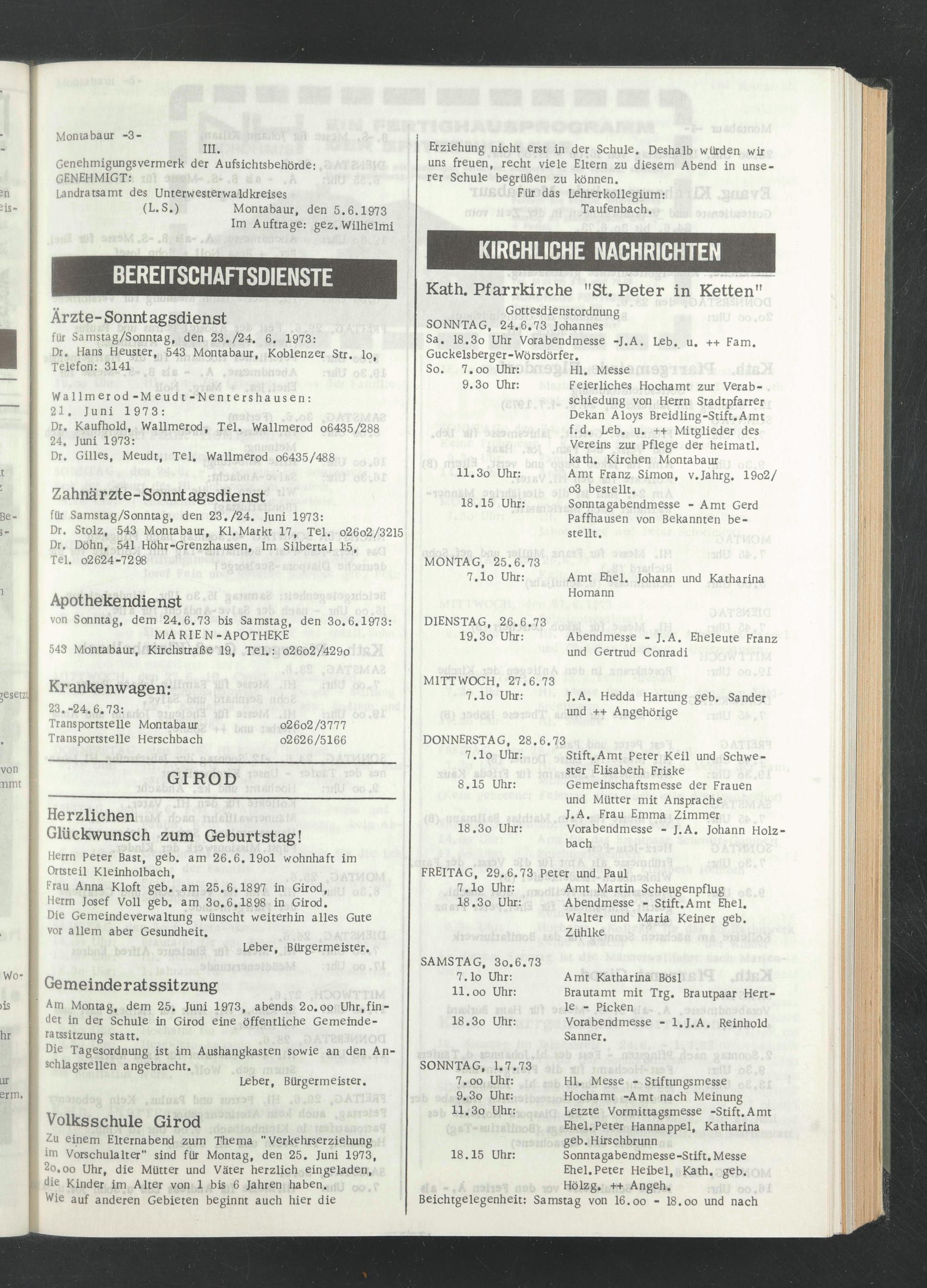 Am Montag, dem 25. Juni 1973, abends 2o.oo Uhr.fin- det in der Schule in Girod eine öffentliche Gemeinde- ratssitzung statt.