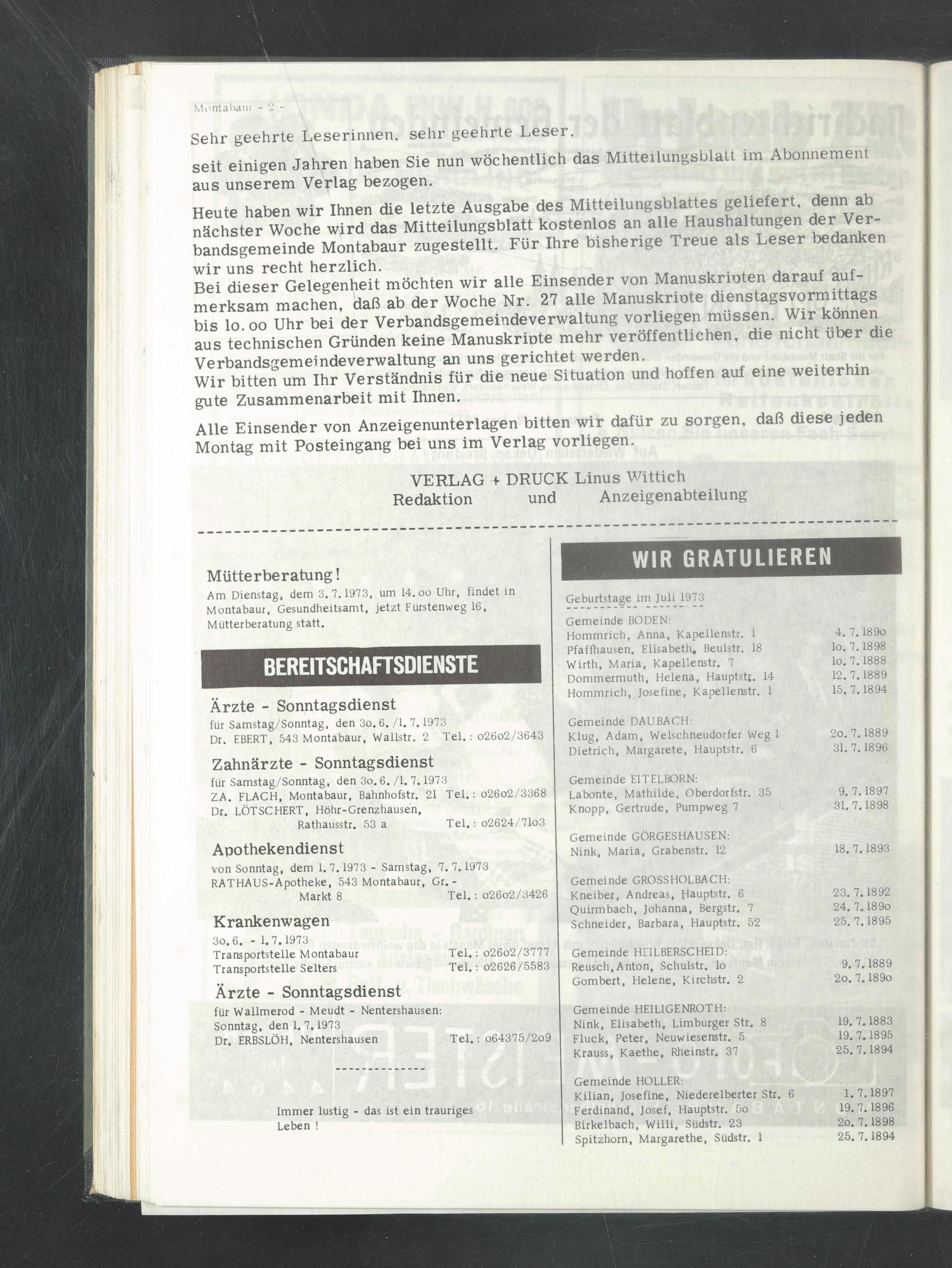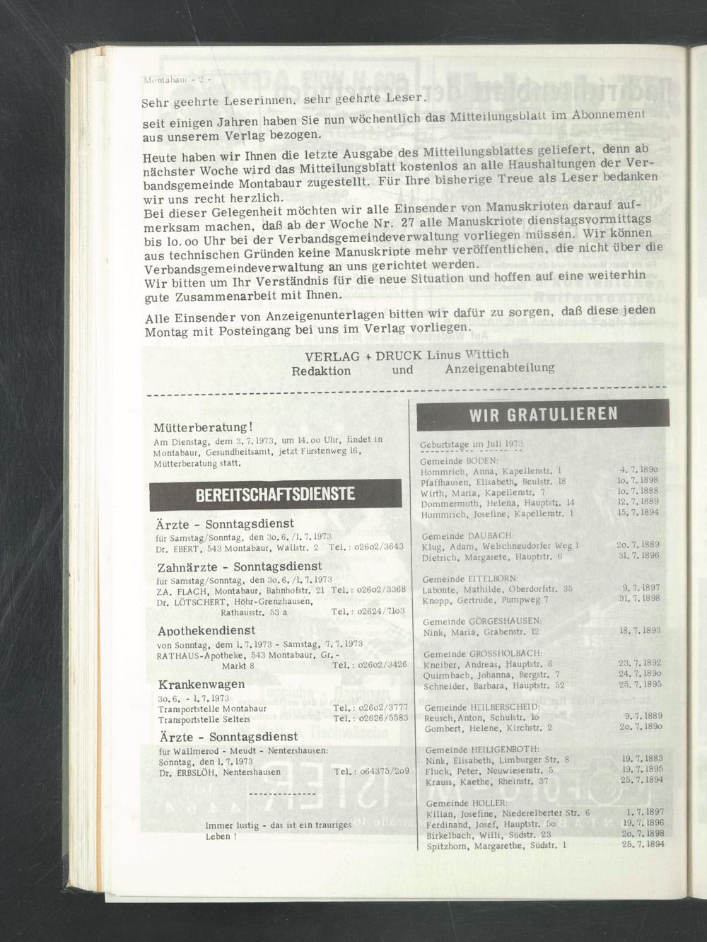 Am Dienstag, dem 3. 7.1973, um 14. oo Uhr, findet in Montabaur, Gesundheitsamt, jetzt Fürstenweg 16, Mütterberatung statt.