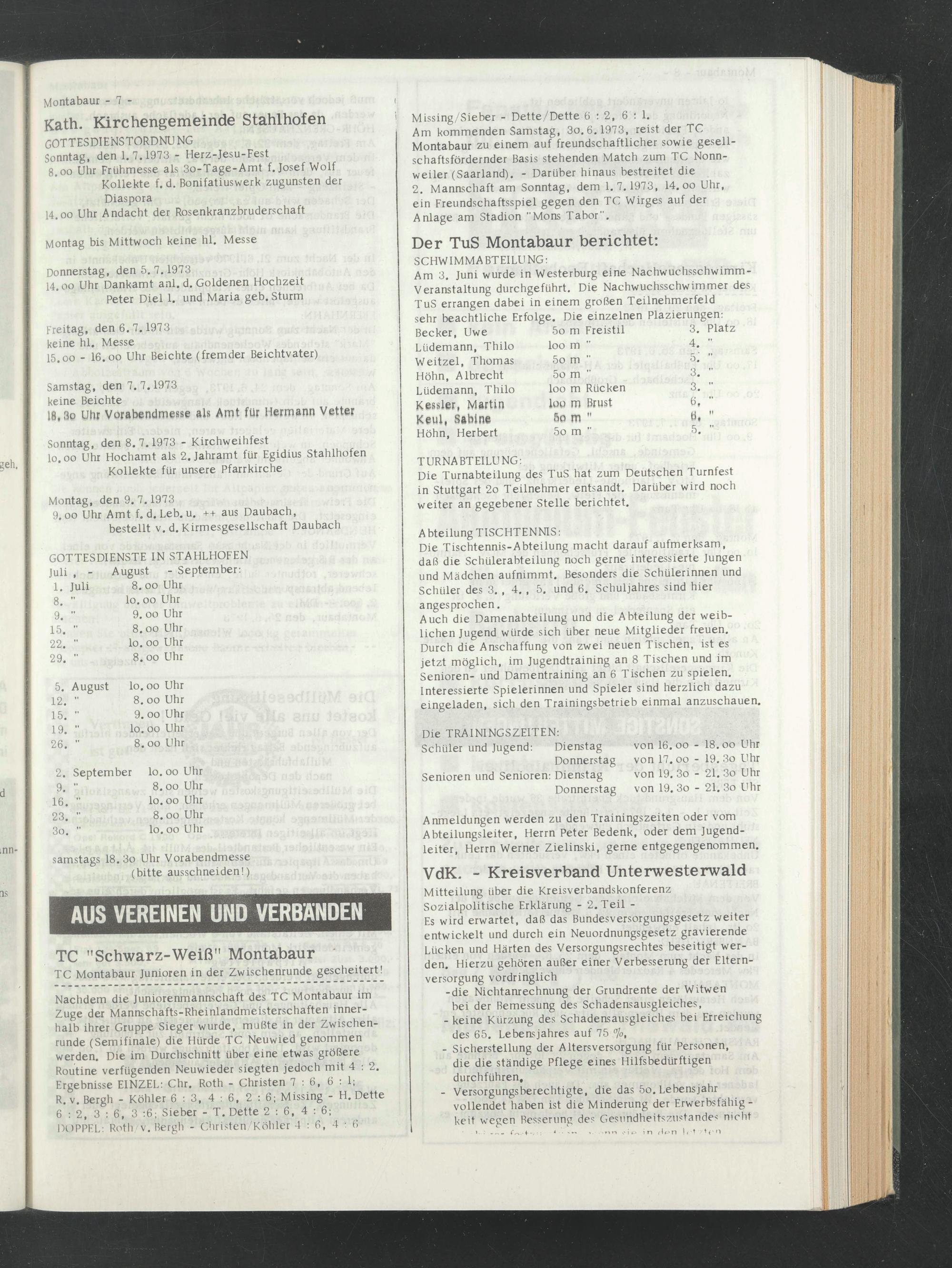 Am kommenden Samstag, 3o. 6 . 1973, reist der TC Montabaur zu einem auf freundschaftlicher sowie gesellschaftsfördernder Basis stehenden Match zum TC Nonn- weiler (Saarland). - Darüber hinaus bestreitet die 2. Mannschaft am Sonntag, dem 1.7. 1973, 14. oo Uhr, ein Freundschaftsspiel gegen den TC Wirges auf der Anlage am Stadion "Mons Tabor".