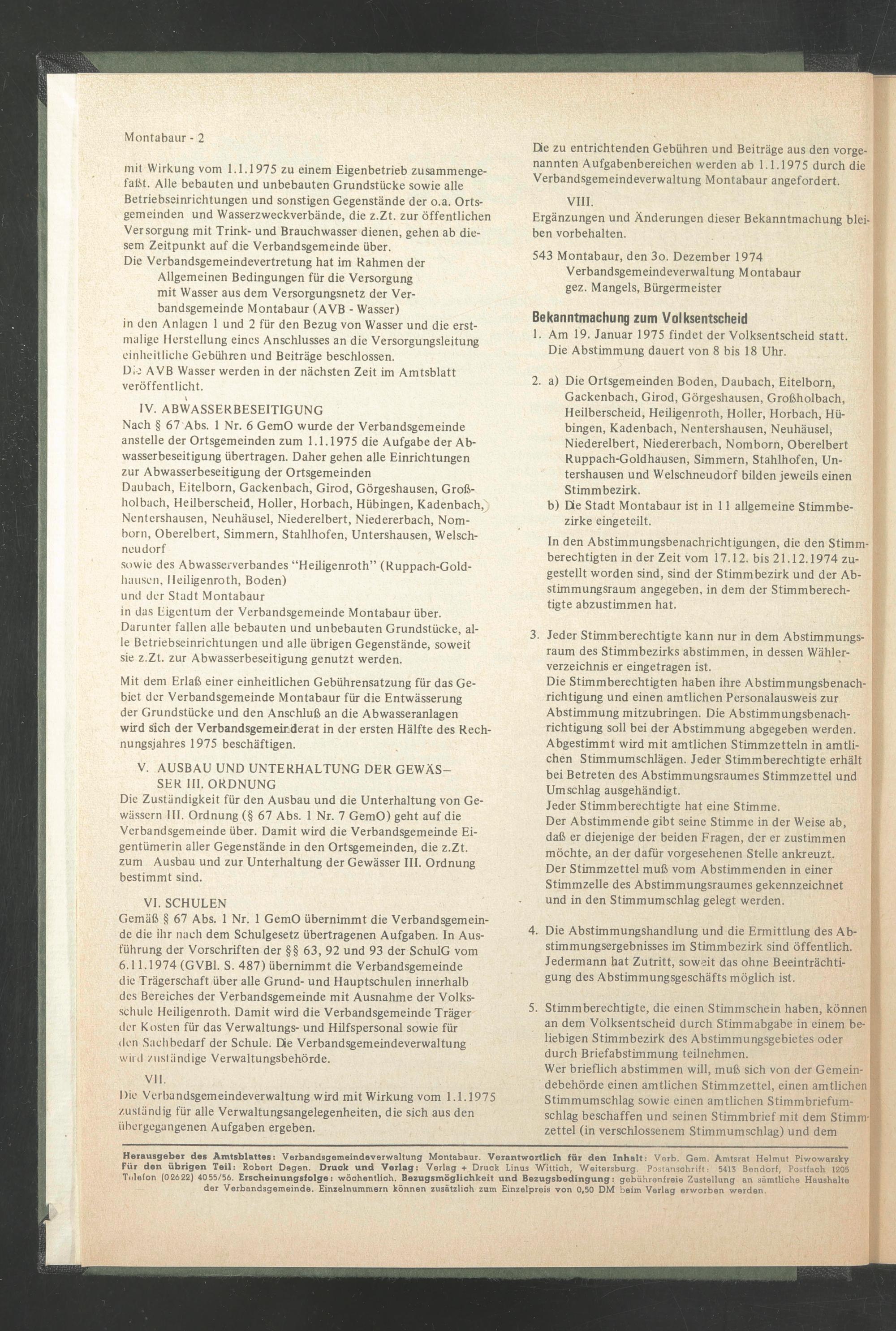Die zu entrichtenden Gebühren und Beiträge aus den vorgenannten Aufgabenbereichen werden ab 1.1.1975 durch die Verbandsgemeindeverwaltung Montabaur angefordert.
