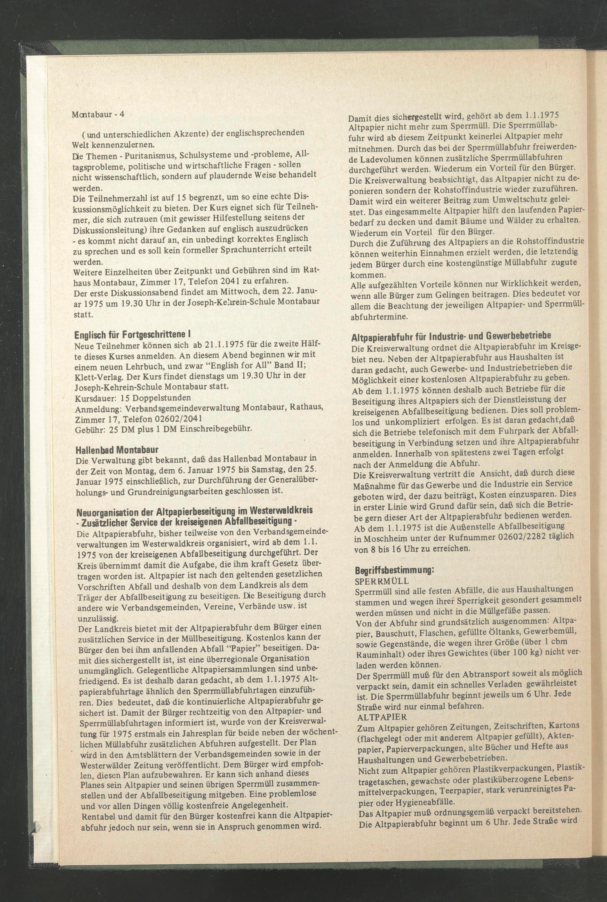 Der Landkreis bietet mit der Altpapierabfuhr dem Bürger einen zusätzlichen Service in der Müllbeseitigung. Kostenlos kann der Bürger den bei ihm anfallenden Abfall “Papier” beseitigen. Damit dies sichergestellt ist, ist eine überregionale Organisation unumgänglich. Gelegentliche Altpapiersammlungen sind unbefriedigend. Es ist deshalb daran gedacht, ab dem 1.1.1975 Altpapierabfuhrtage ähnlich den Sperrmüllabfuhrtagen einzuführen. Dies bedeutet, daß die kontinuierliche Altpapierabfuhr gesichert ist. Damit der Bürger rechtzeitig von den Altpapier- und Sperrmüllabfuhrtagen informiert ist, wurde von der Kreisverwaltung für 1975 erstmals ein Jahresplan für beide neben der wöchentlichen Müllabfuhr zusätzlichen Abfuhren aufgestellt. Der Plan wird in den Amtsblättern der Verbandsgemeinden sowie in der Westerwälder Zeitung veröffentlicht. Dem Bürger wird empfohlen, diesen Plan aufzubewahren. Er kann sich anhand dieses Planes sein Altpapier und seinen übrigen Sperrmüll zusammenstellen und der Abfallbeseitigung mitgeben. Eine problemlose und vor allen Dingen völlig kostenfreie Angelegenheit.