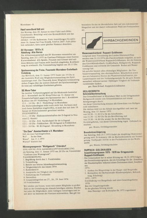 Am Samstag, dem 25.1.1975 findet die diesjährige Holzversteigerung statt. Es kommen 146 rm Buchenbrennholz zur Versteigerung. Treffpunkt 10 Uhr in der Fuchskauten an der Wolfsquelle.