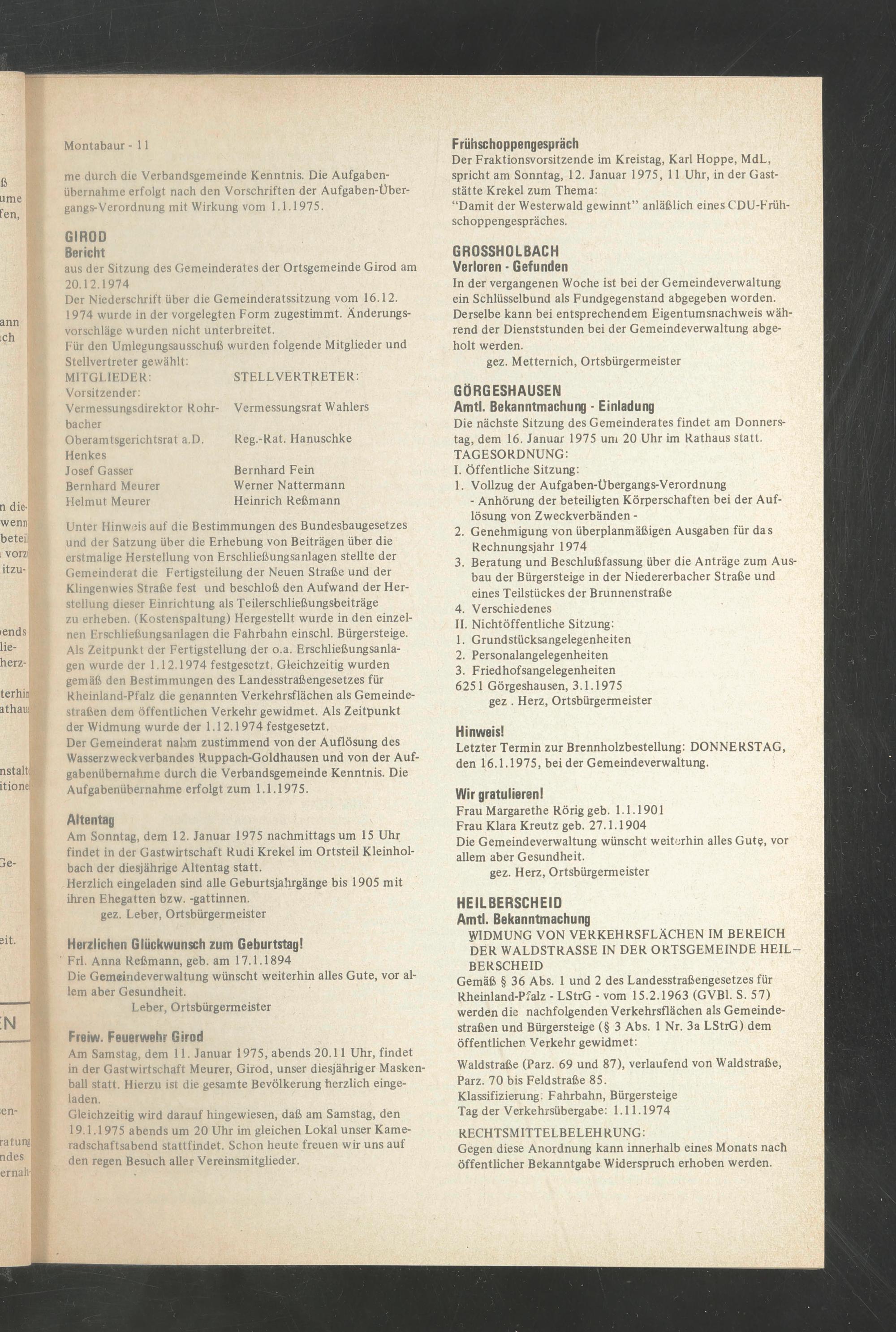 aus der Sitzung des Gemeinderates der Ortsgemeinde Girod am 20.12.1974