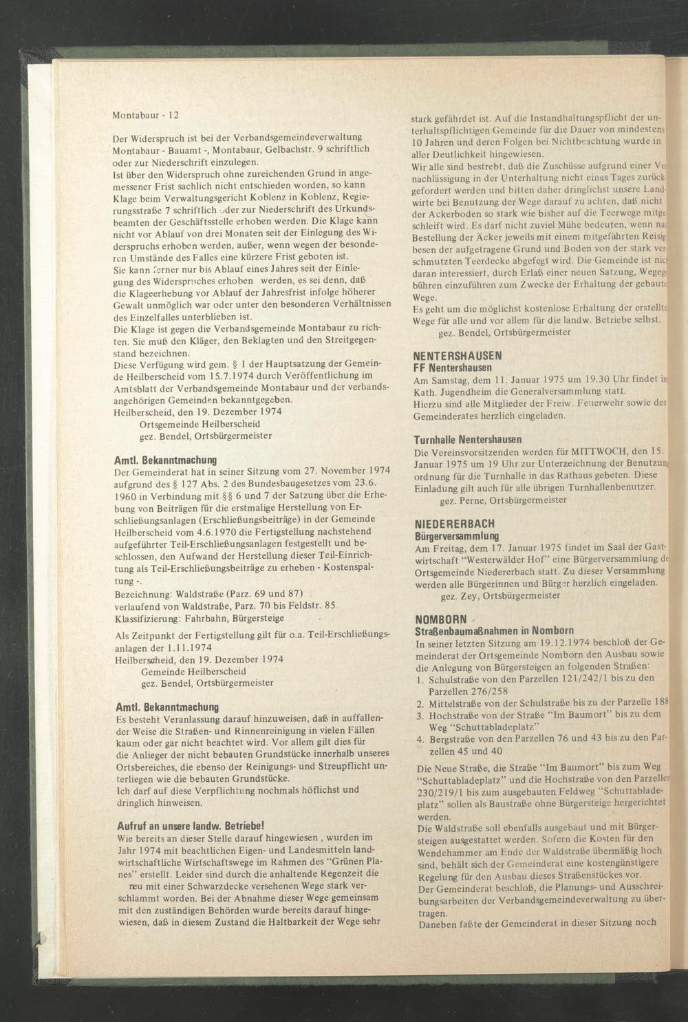 Als Zeitpunkt der Fertigstellung gilt für o.a. Teil-Erschließungsanlagen der 1.11.1974 Heilberscheid, den 19. Dezember 1974 Gemeinde Heilberscheid gez. Bendel, Ortsbürgermeister