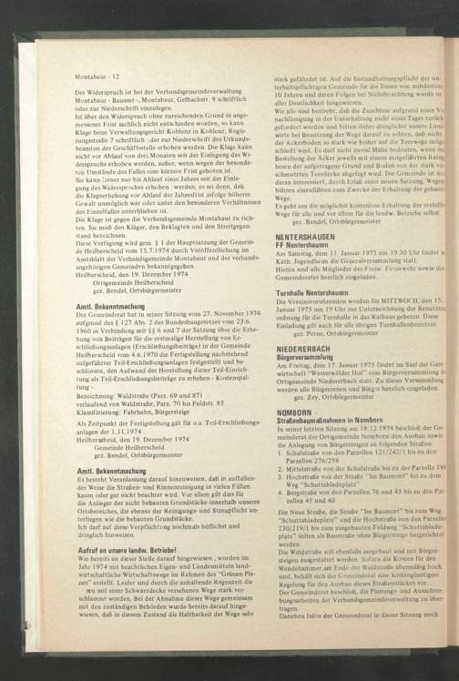 Am Freitag, dem 17. Januar 1975 findet im Saal der Gastwirtschaft “Westerwälder Hof” eine Bürgerversammlung de Ortsgemeinde Niedererbach statt. Zu dieser Versammlung werden alle Bürgerinnen und Bürger herzlich eingeladen, gez. Zey, Ortsbürgermeister