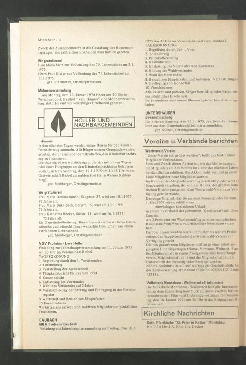 Am Montag, dem 13. Januar 1974 findet um 20 Uhr in Welschneudorf, Gasthof “Zum Hannes” eine Möhnenversamm- lung statt. Es wird um vollzähliges Erscheinen gebeten.