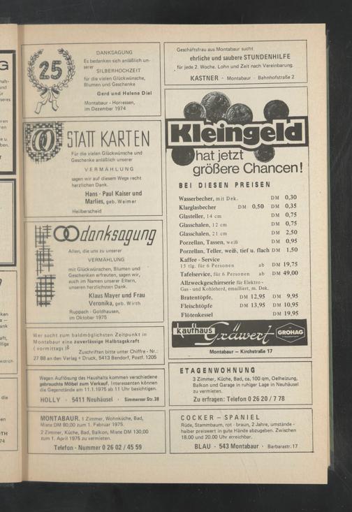 MONTABAUR. 1 Zimmer, Wohnküche, Bad, Miete DM 80,00 zum 1. Februar 1975.