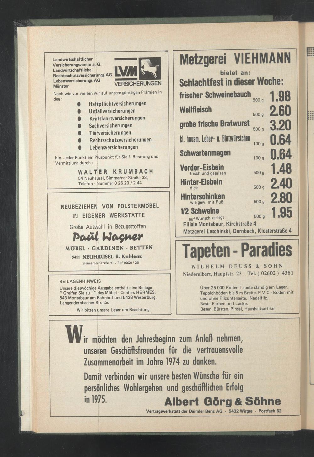 Unsere dieswöchige Ausgabe enthält eine Beilage " Greifen Sie zu ! " des Möbel - Centers HERMES, 543 Montabaur am Bahnhof und 5438 Westerburg, Langendernbacher Straße.