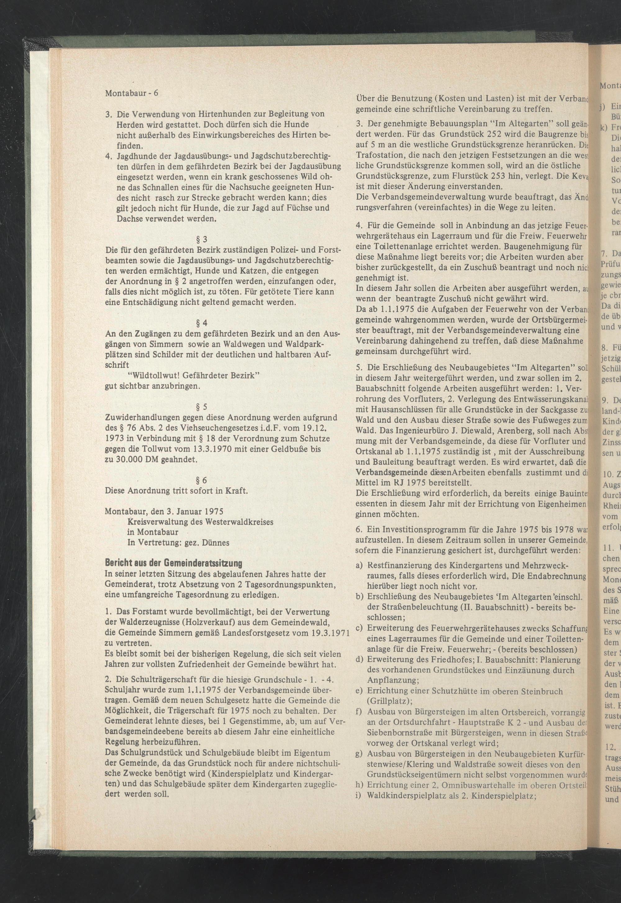 5. Die Erschließung des Neubaugebietes “Im Altegarten” soll in diesem Jahr weitergeführt werden, und zwar sollen im 2. Bauabschnitt folgende Arbeiten ausgeführt werden: 1. Verrohrung des Vorfluters, 2. Verlegung des Entwässerungskanall mit Hausanschlüssen für alle Grundstücke in der Sackgasse zul Wald und den Ausbau dieser Straße sowie des Fußweges zum* Wald. Das Ingenieurbüro J. Diewald, Arenberg, soll nach Absl mung mit der Verbandsgemeinde, da diese für Vorfluter und f Ortskanal ab 1.1.1975 zuständig ist, mit der Ausschreibung und Bauleitung beauftragt werden. Es wird erwartet, daß die jj Verbandsgemeinde diesenArbeiten ebenfalls zustimmt und di| Mittel im RJ 1975 bereitstellt.
