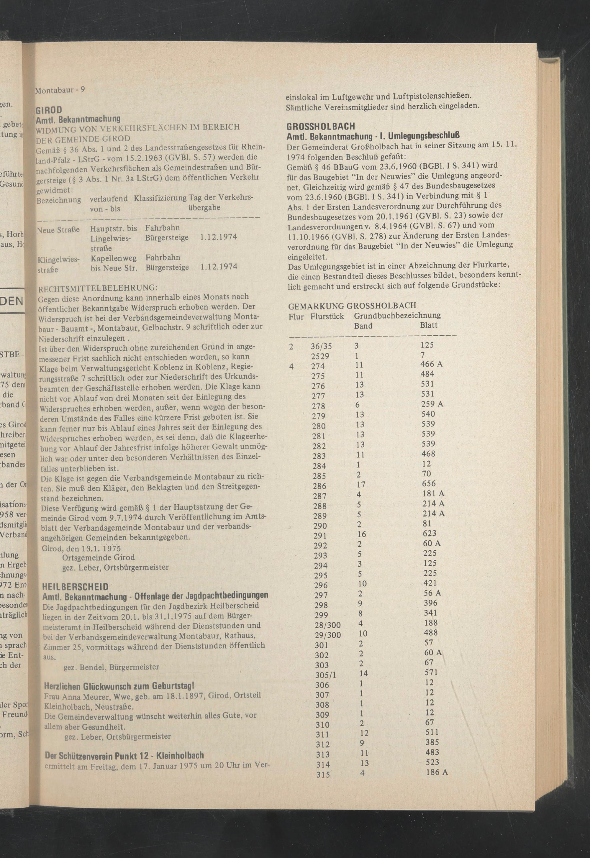 Die Jagdpachtbedingungen für den Jagdbezirk Heilberscheid liegen in der Zeitvom 20.1. bis 31.1.1975 auf dem Bürgermeisteramt in Heilberscheid während der Dienststunden und bei der Verbandsgemeindeverwaltung Montabaur, Rathaus, Zimmer 25, vormittags während der Dienststunden öffentlich aus.