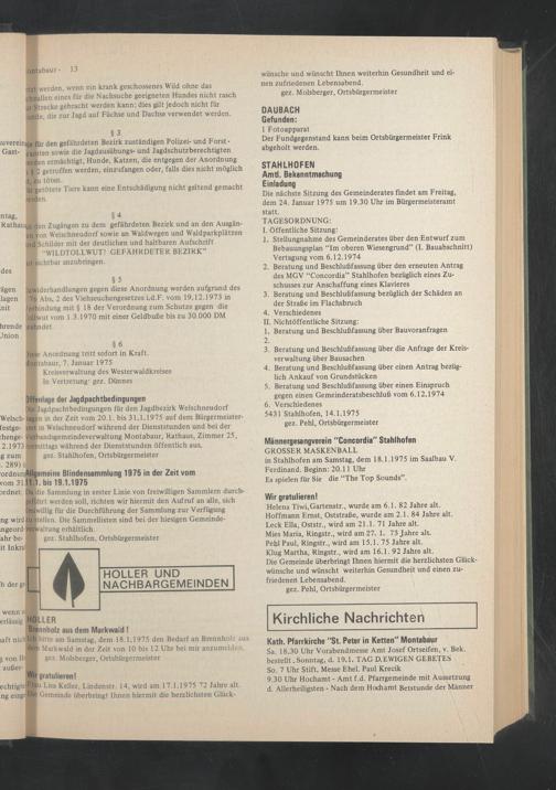 Die nächste Sitzung des Gemeinderates findet am Freitag, dem 24. Januar 1975 um 19.30 Uhr im Bürgermeisteramt statt.